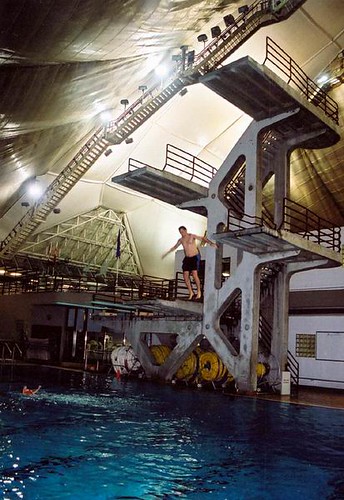 Утомленные всеми этими впечатлениями, мы решили остаток дня провести в Aquatic Centre - искупаться в бассейне. Пока мы добрались до него, началась гроза и полил дождь, поэтому пробежав от парковки до входа мы уже были почти искупавшиеся. На самом деле этот центр оказался серьезным спортивным плавательным бассейном с несколькими плавательными акваториями, с прыгательными вышками разных высот и специальным бассейном для дайвинга глубиной 5 метров. Я стал пробовать вышки и выше 5 метров лезть не рискнул - сверху даже эти 5 метров выглядят как все 20. Ну еще мой рост 2м, так что 22м. Как люди прыгают с 11 метров и как они уберегают выступающие части тела от отбивания о воду - не понимаю.