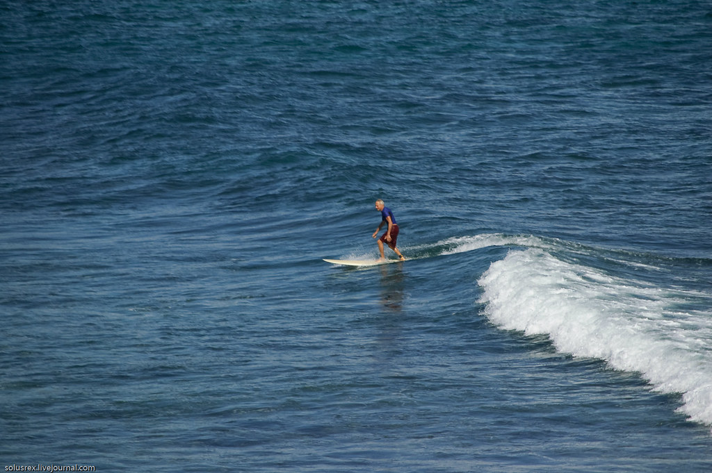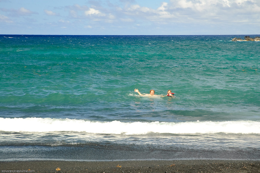Идет волна... В первый день мы как-то недооценили мощь стихии, и переждав пару волн, мы с младшей поплыми подальше от берега, чтобы качаться на волнах там, где они еще не обрываются. Сначала все шло по плану, но вскоре мы увидели спасателя, который что-то кричал нам, и показывал на море позади нас. А сзади шел настоящий Девятый вал. Неожиданно море отошло на столько, что я встал на дно, и волна была выше меня еще на пару метров, и начинала заворачиваться... через несколько секунд на нас обрушился поток воды. Выплыли, а сзади шла следующая... ударило еще раз, и на этот раз мы успели выбраться. Намек мы поняли и после этого купались в более спокойных местах.