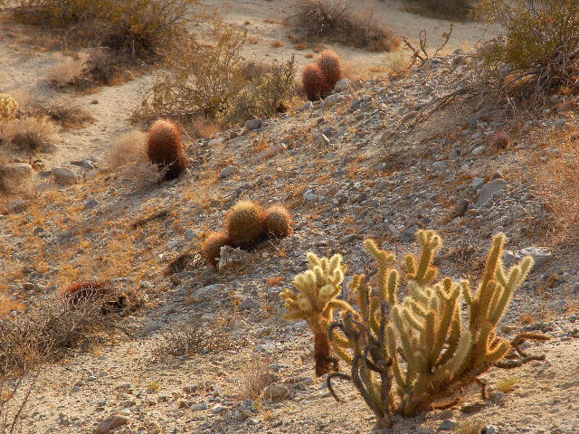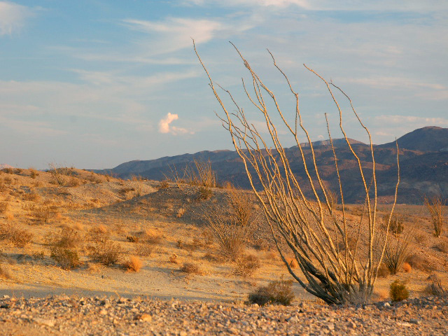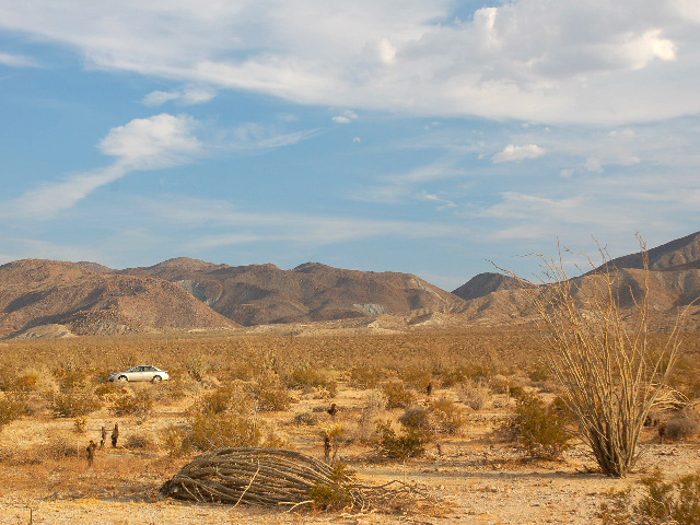 В пути. Так я перемещаюсь в пространстве. Точнее - в плоскости. Нет, по поверхности сфероида. Да, так вернее. Сзади - куст со смешным названием Окотилло.