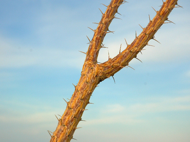 Однако ветки у этого куста совсем не смешные. Хвататься не стоит, колючки очень твердые.