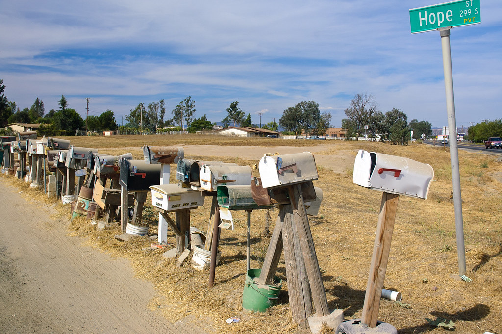 Выехал я поздно, до обеда купался в море. Это не так далеко от Сан-Диего, всего километров 120. Мне было забавно увидеть шеренги почтовых ящиков на пересечении дорог. Почтальон, видимо, движется по главной дороге и не хочет заезжать на такие улочки, даже если они называются так: Hope (Надежда). Очень органично сочетающееся с почтовыми ящиками название!