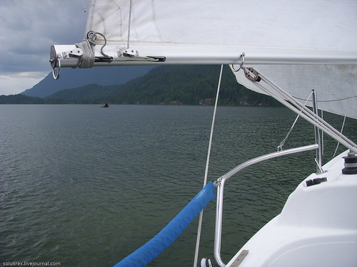 Ветер, на самом деле, подкачал. Да и волны тоже ... подкачали. Дул ветер ровно настолько, чтобы яхта перемещалась со скоростью пешехода. Зато это позволяло учиться парусному управлению. Меня посадили за штурвал, поскольку иначе толку от меня в управлении парусами все равно не было.