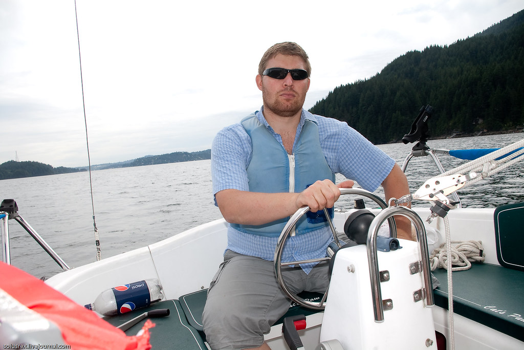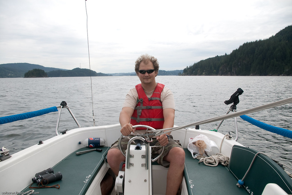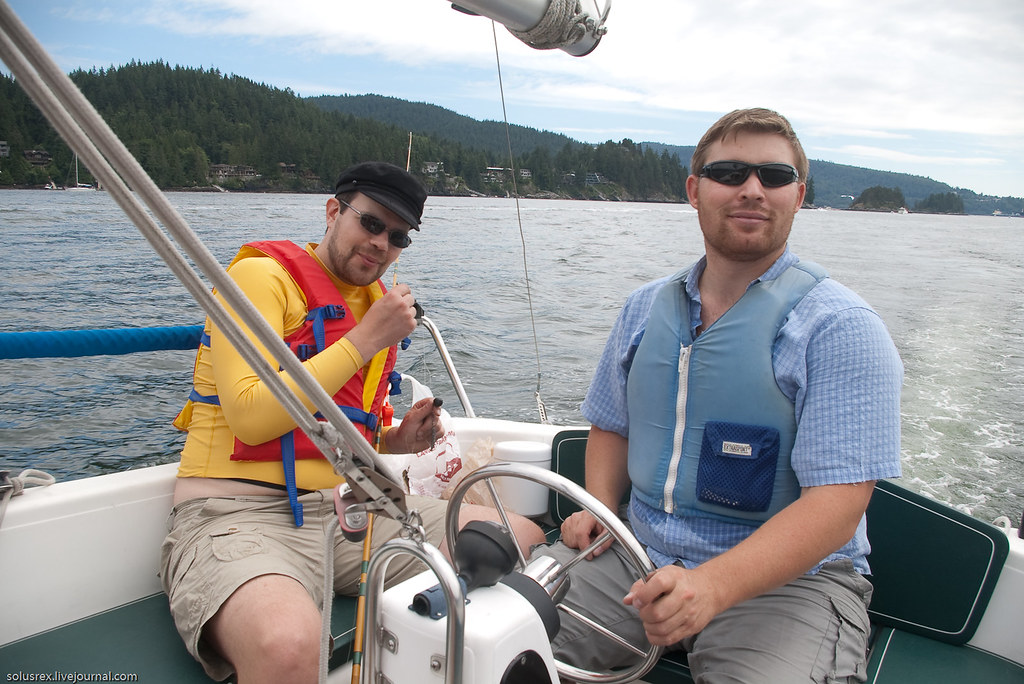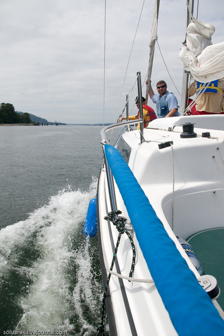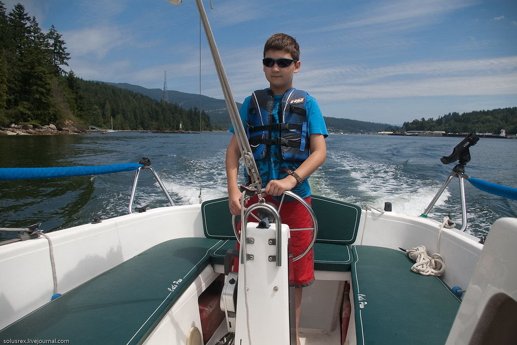Ходили в Indian Arm, по-сути первое морское путешествие. Сначала пришлось довольно долго идти под мотором, и только когда мы обогнули Белкару, наконец стал поддувать легкий попутный ветер. Машина была застопорена и корабль переведен на парусный ход. Севернее Белкары на траверзе Енотового острова сделали первую остановку и пообедали на верхней палубе. Вниманию путешественников были предложены бутерброды, свежие овощи и фрукты. В качестве напитков успехом пользовалось безалкагольное пиво. Купаться никто не стал, хотя вода и манила прохладной свежестью.