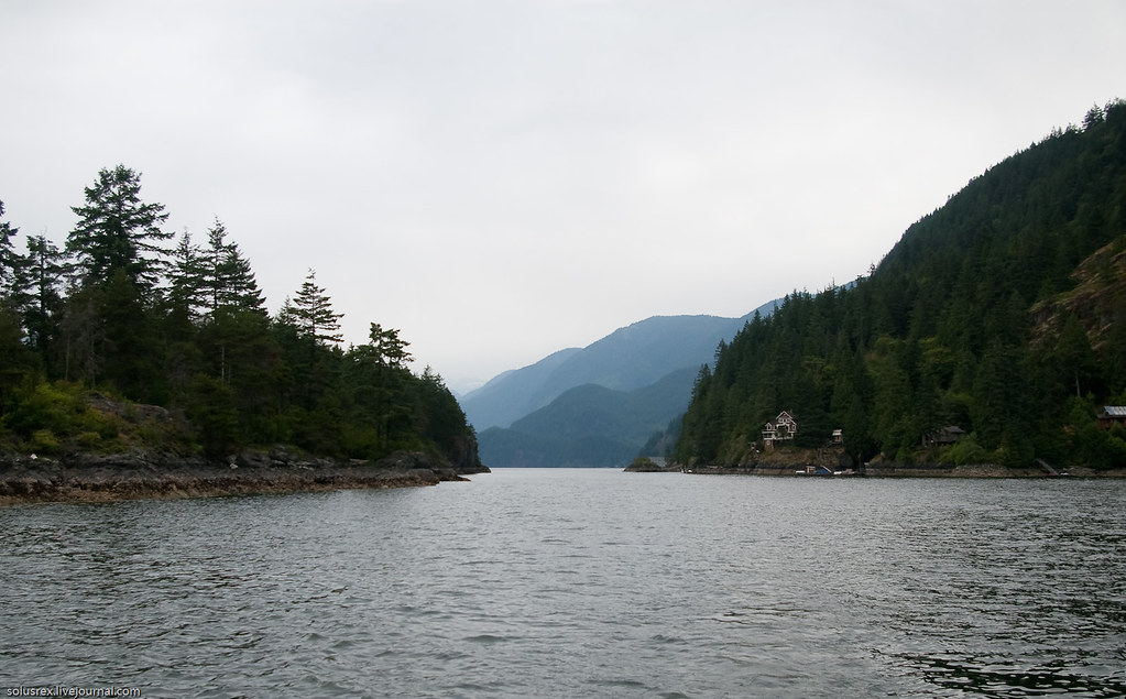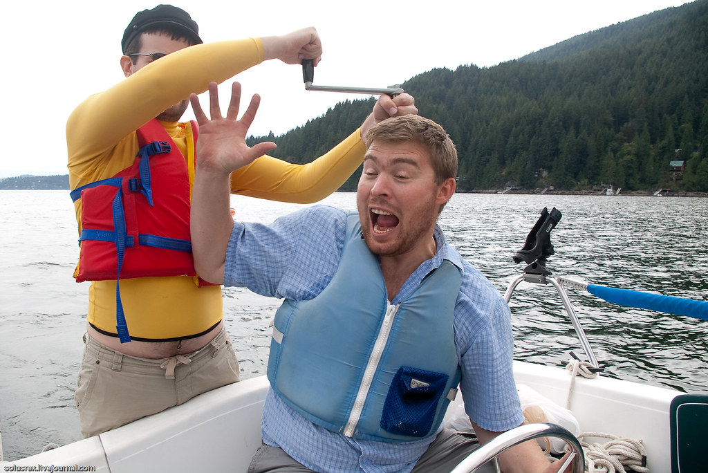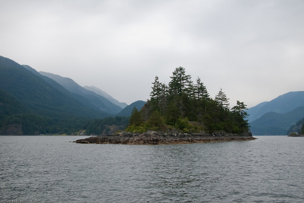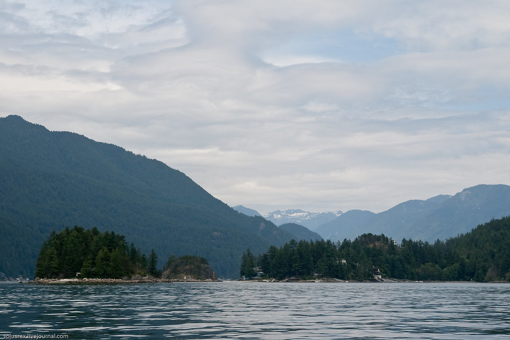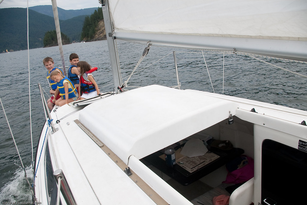 Ходили в Indian Arm, по-сути первое морское путешествие. Сначала пришлось довольно долго идти под мотором, и только когда мы обогнули Белкару, наконец стал поддувать легкий попутный ветер. Машина была застопорена и корабль переведен на парусный ход. Севернее Белкары на траверзе Енотового острова сделали первую остановку и пообедали на верхней палубе. Вниманию путешественников были предложены бутерброды, свежие овощи и фрукты. В качестве напитков успехом пользовалось безалкагольное пиво. Купаться никто не стал, хотя вода и манила прохладной свежестью.