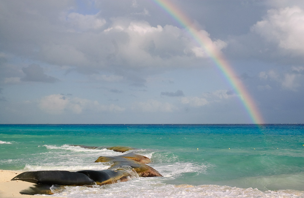 Налетел короткий дождик и согнал отдыхающих с пляжа. На смену им появилась радуга.