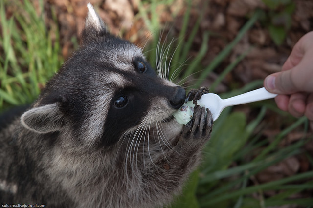 Енот тянет ложку к себе, но не наглеет. Другое дело - с детьми. Слегка цапнуть за руку - и вот вся ложка в твоем распоряжении!