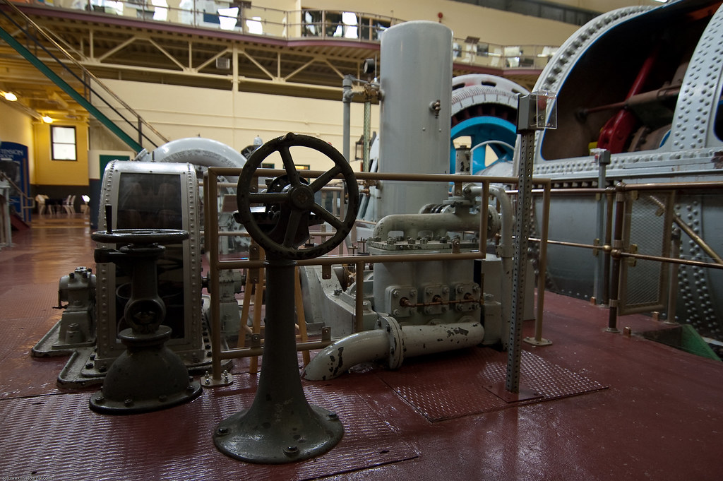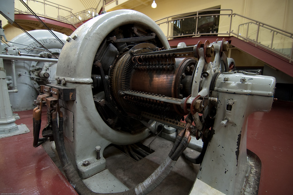 Спустимся в машинный зал. На переднем плане - генератор постоянного тока (DC). Этот ток использовался для возбуждения электромагнитов основных генераторов.