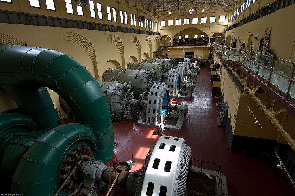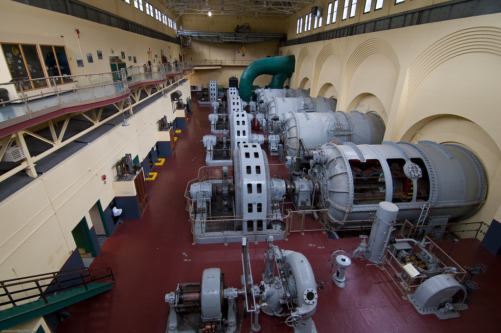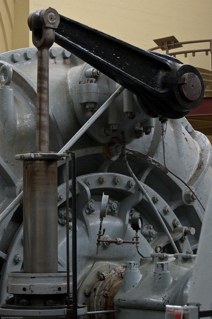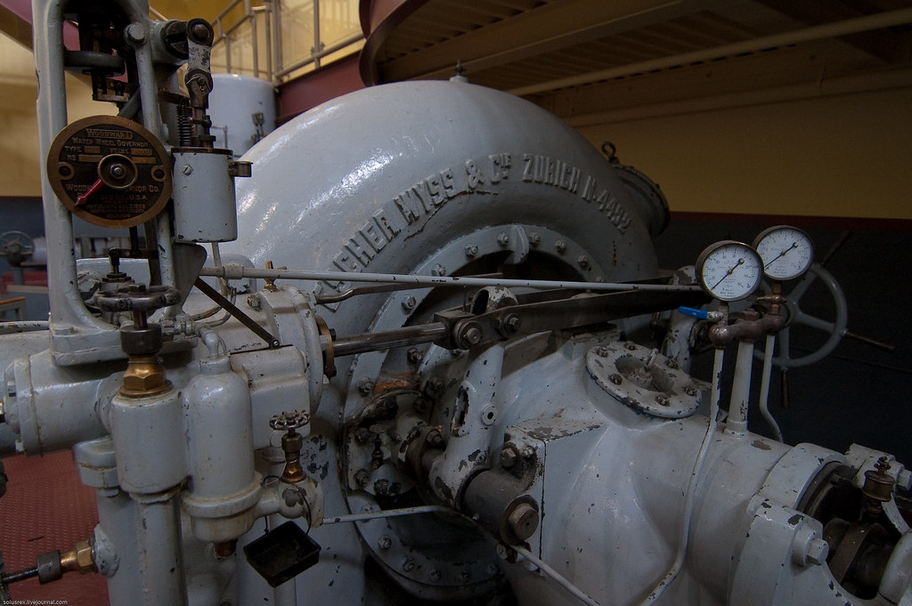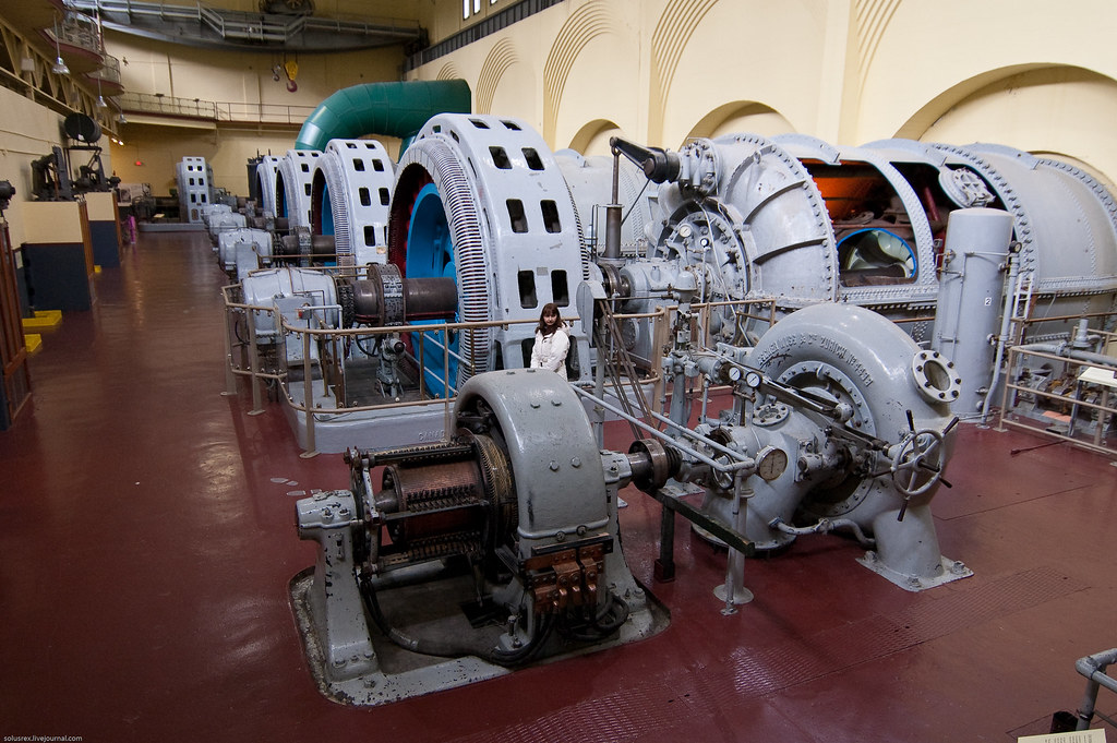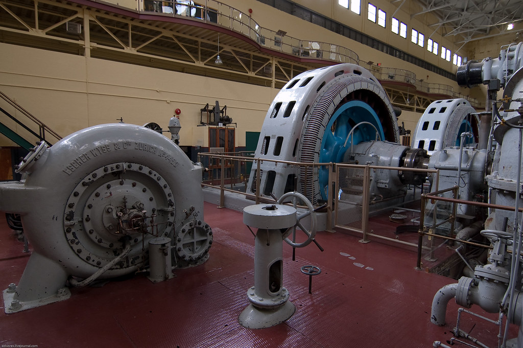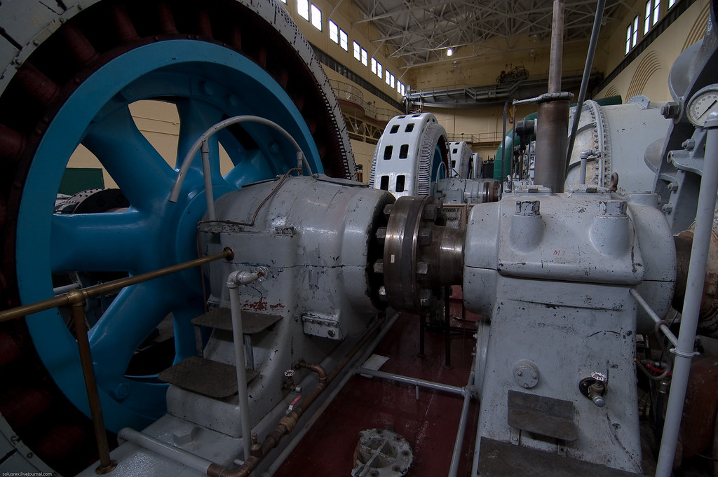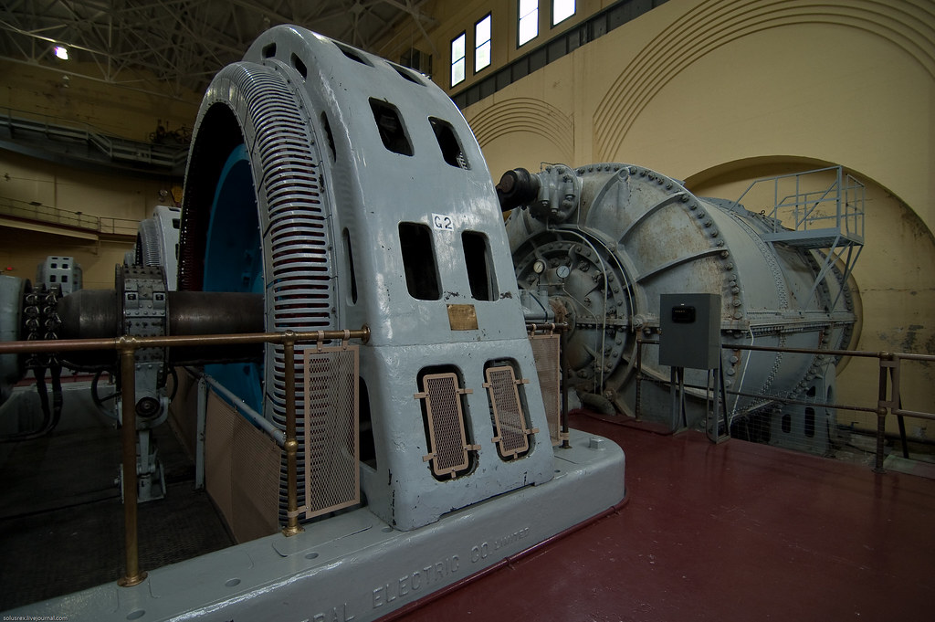 Наконец, мы выходим в машинный зал. На переднем плане - тот самый генератор, который добавили в 50-х. Интересно, как изменилась концепция гидрогенератора за это время (а, чего там мелочиться, буду вставлять большие картинки).