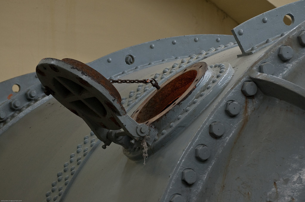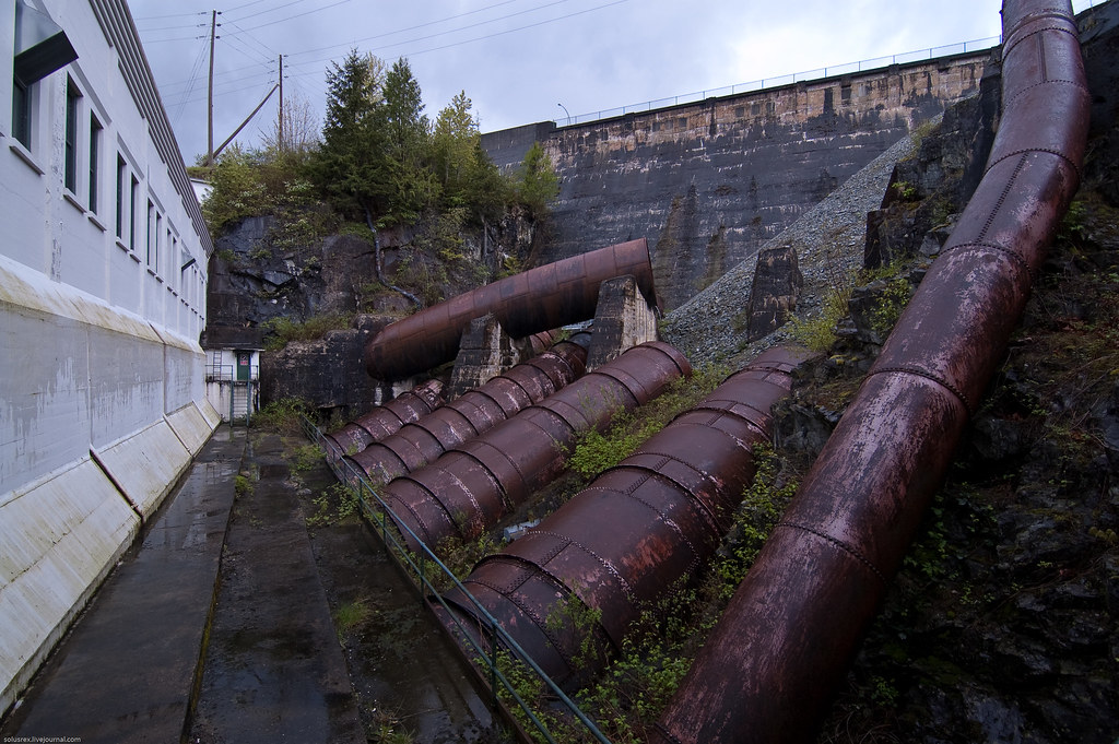 Вид снаружи. Сейчас эти трубы (в два человеческих роста, кстати!) отключены, а когда-то по ним поступала вода к генераторам.