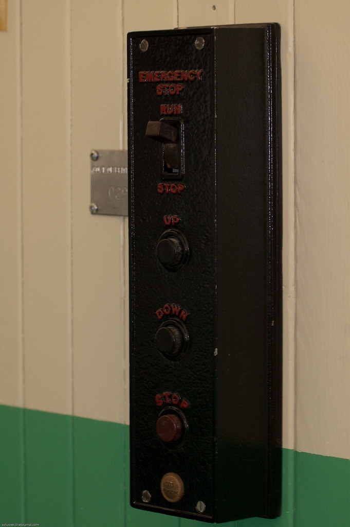 Пульт упраления лифтом. Есть только кнопки "стоп", "вверх" и "вниз". Видимо, пассажиру приходилось пилотировать лифт самостоятельно.