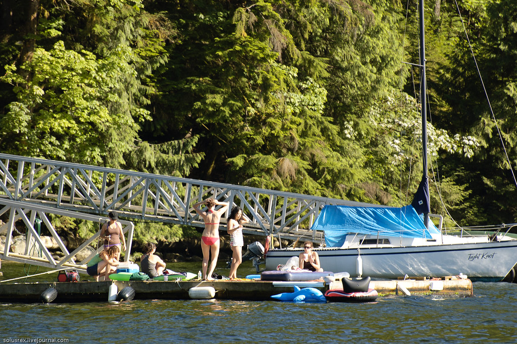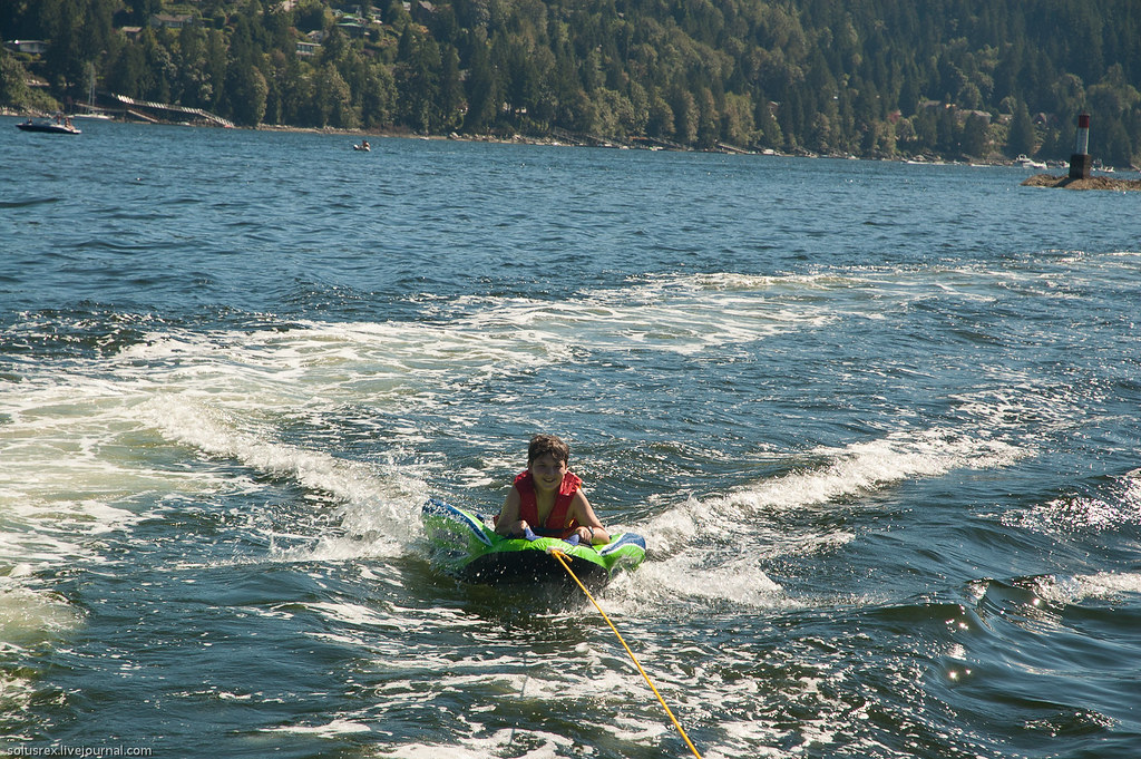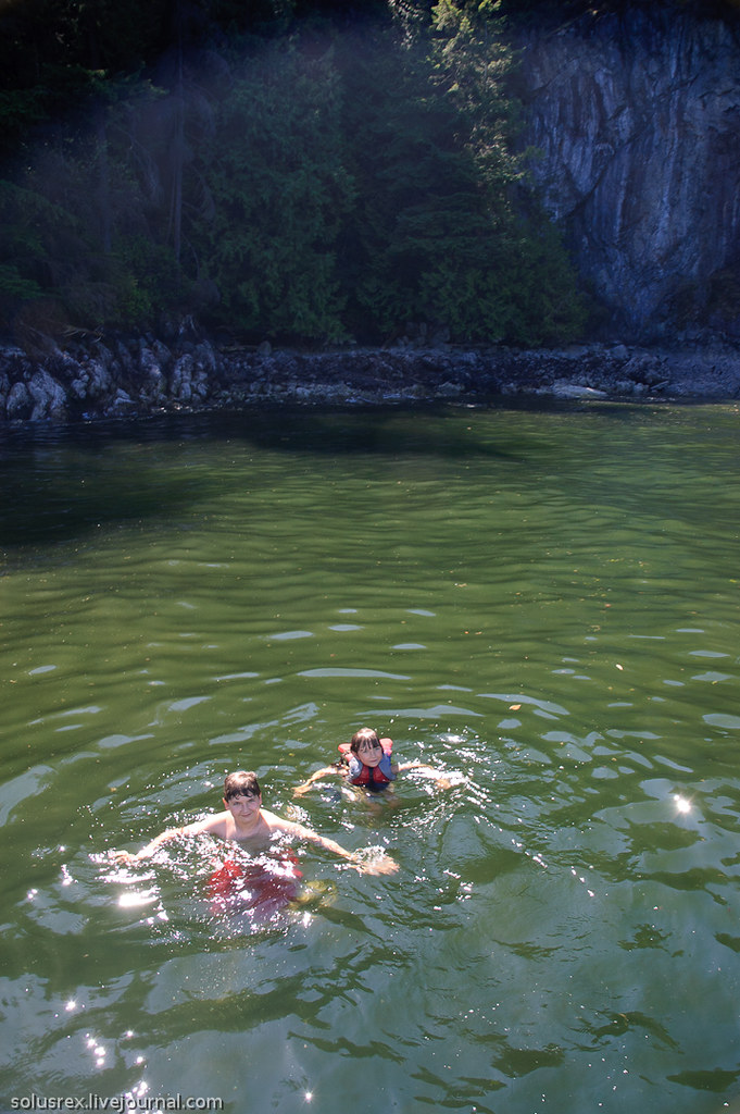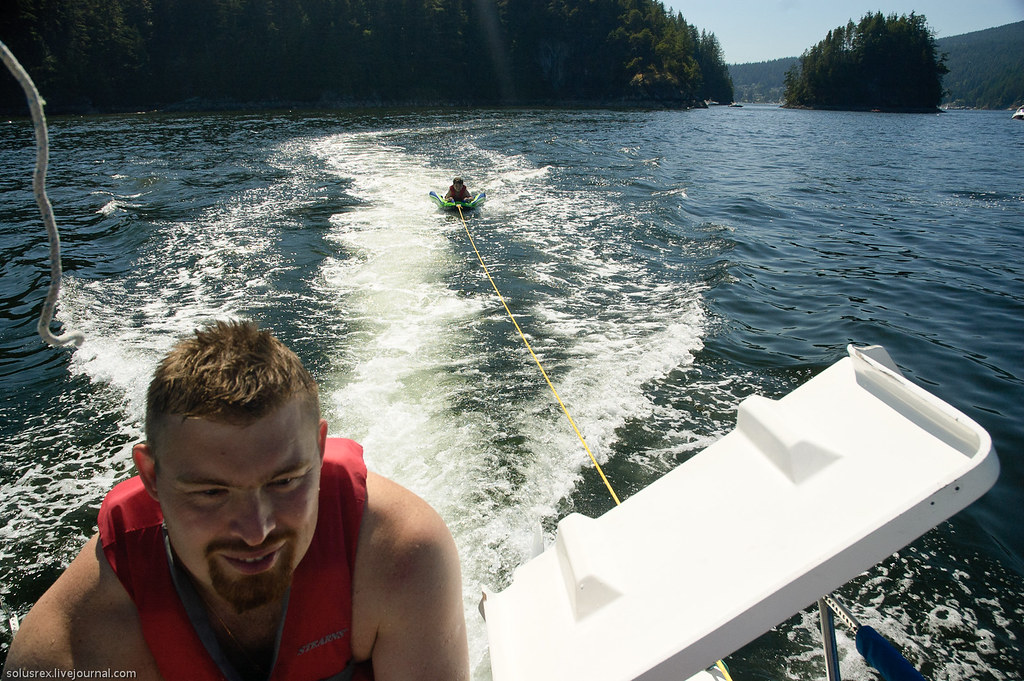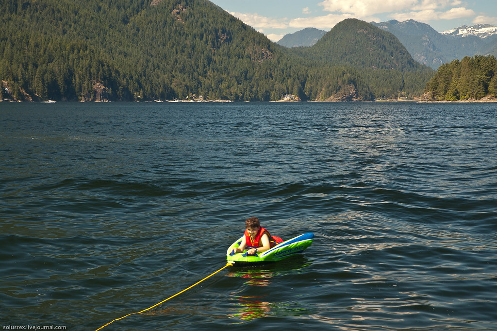 А погода-то, погода какая была на выходных! Неужели кто-то в такие дни полезет обливаясь потом в горы? Хотя всегда найдутся чудаки. Мы и собирались стать такими чудаками, но нам повезло. Мы вообще-то с детьми собирались хайкнуть на Garibaldi Lake, но вместо того провели два дня на воде Indian Arm, чему и рады несказанно. Купались, катались на бублике, ходили под парусами, закусывали на свежем воздухе, ночевали на воде, скатывались по водопаду как по водным горкам - красота, доложу я вам.