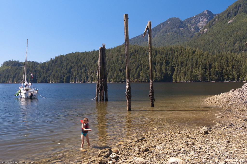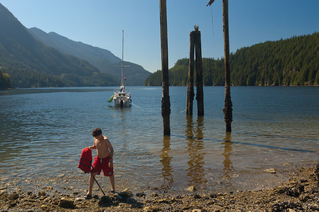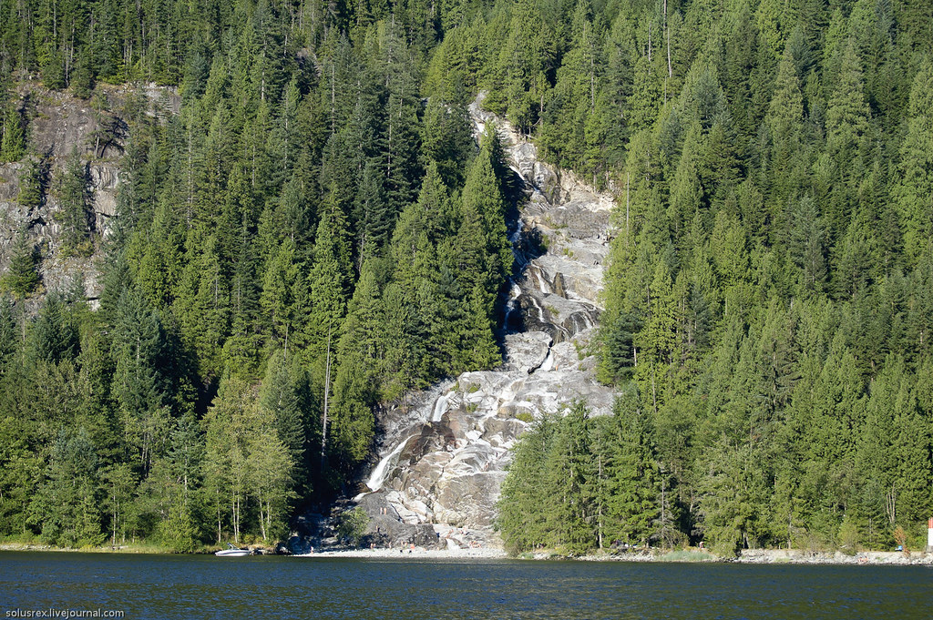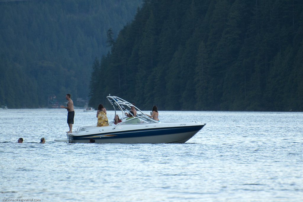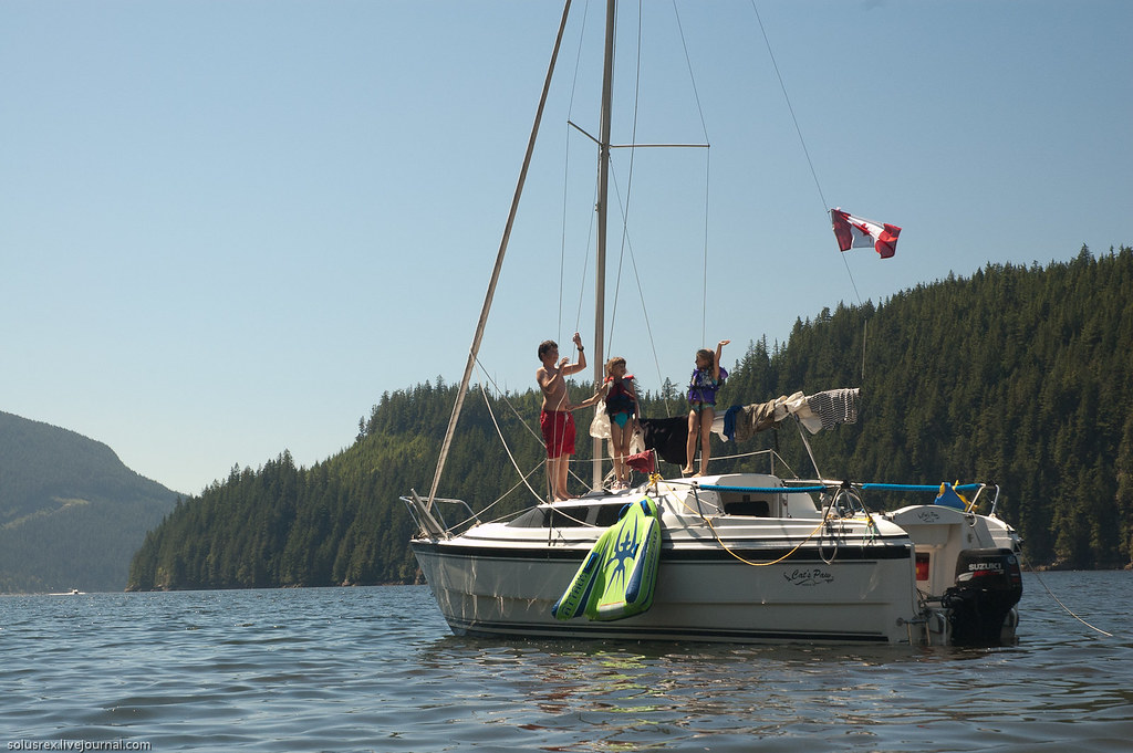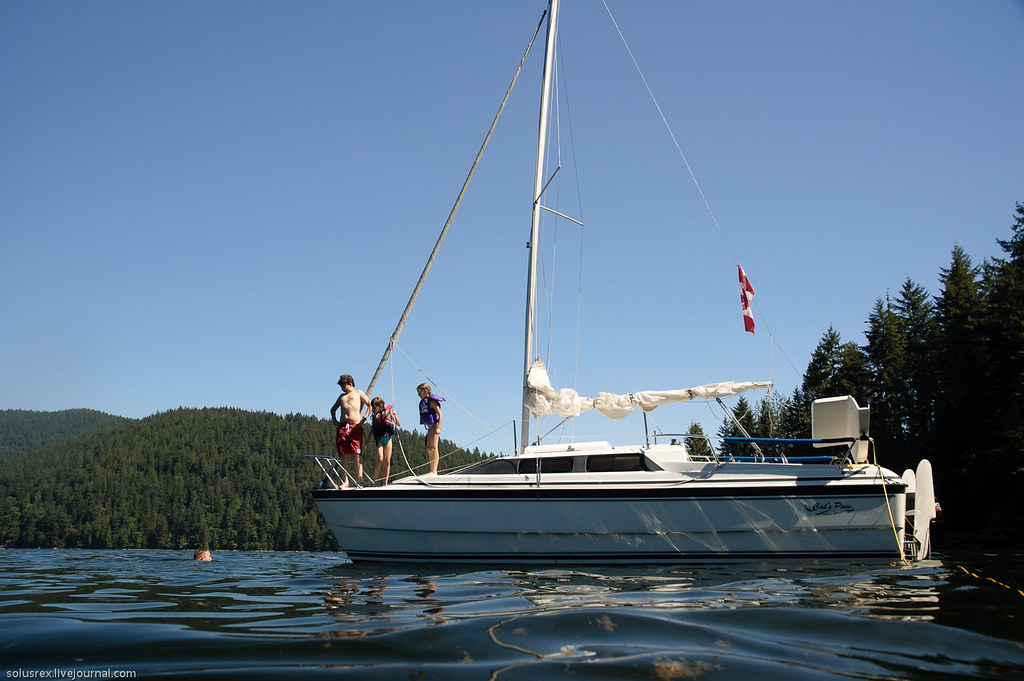 А погода-то, погода какая была на выходных! Неужели кто-то в такие дни полезет обливаясь потом в горы? Хотя всегда найдутся чудаки. Мы и собирались стать такими чудаками, но нам повезло. Мы вообще-то с детьми собирались хайкнуть на Garibaldi Lake, но вместо того провели два дня на воде Indian Arm, чему и рады несказанно. Купались, катались на бублике, ходили под парусами, закусывали на свежем воздухе, ночевали на воде, скатывались по водопаду как по водным горкам - красота, доложу я вам.