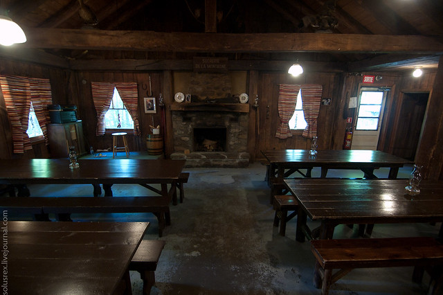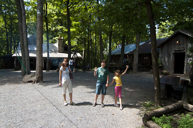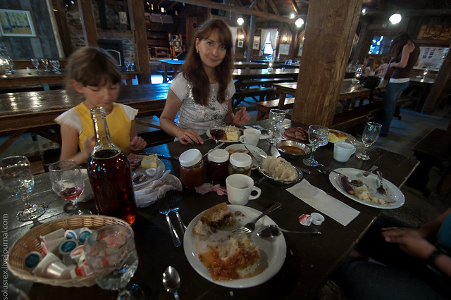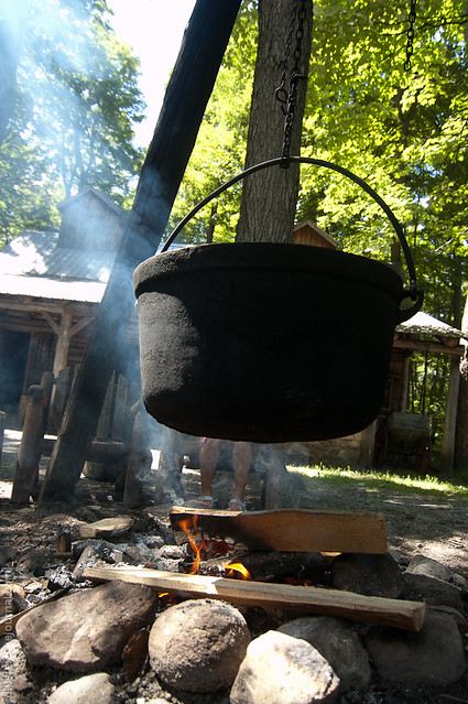 Так, про сыр рассказал, теперь про Sucrerie de la Montagne - сироповарня, превращенная в туристический аттракцион. Заехали мы туда без какого-либо четкого плана, экспромтом по пути в Квебек-сити. Запарковались, стали озираться вокруг. Человек в телеге, запряженной лошадью окликнул нас, спросил хотим ли мы обедать. Обедать мы хотели и сели к нему в бричку. Медленным шагом нас отвезли к каким-то деревянным строениям в лесу. В центре дымился котелок на треноге, в нем что-то аппетитно и сладко булькало.