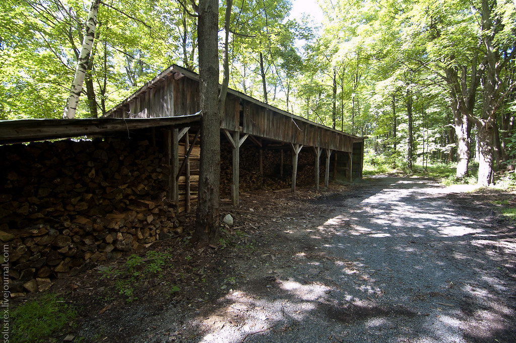Нас окликнул приветливый бородач, оказавшийся хозяином этого места. Сказал, что распорядится о обеде, а пока покажет нам четверым свое хозяйство. Он нам рассказал, что кленовый сок начинают собирать в феврале-марте, сверлят дырки в деревьях, и в них вбивают трубочки, а на них вешают ведра. Таким образом развешивают сотни ведер. Потом сок, в котором всего несколько процентов сахара, выпаривают. Для этого все оставшееся время года они занимаются заготовкой дров.