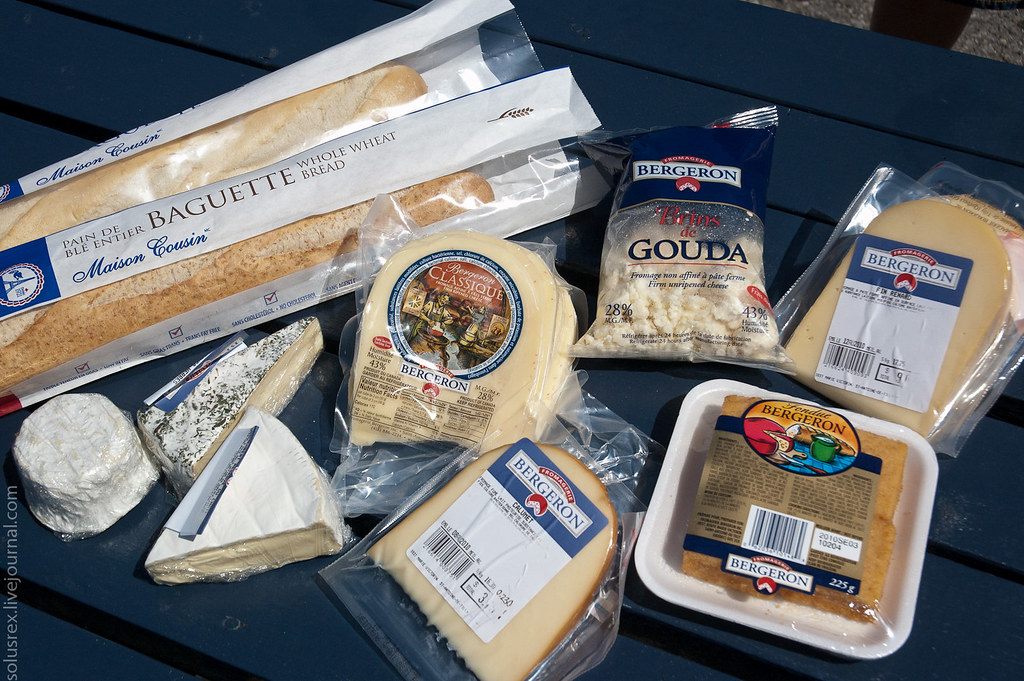 "Там" оказался небольшой магазинчик-аутлет, и я даже забыл фотографировать, потому что мы увидели витрину с сыыыыром! Глаза, конечно, не разбегались настолько уж, но ... короче говоря, захотелось попробовать всё. Мы набрали почти наугад разных сортов, купили пару свежих багетов, продававшихся там же и пошли на улицу за столик закусывать. Очень вкусным оказался несозревший сыр Гауда, комочки которого слегка пружинят на зубах, и при этом такие сочные и свежие! Съев его в минуту, мы тут же побежали за добавкой. Вкуснее сыра я, кажется, в жизни не ел.