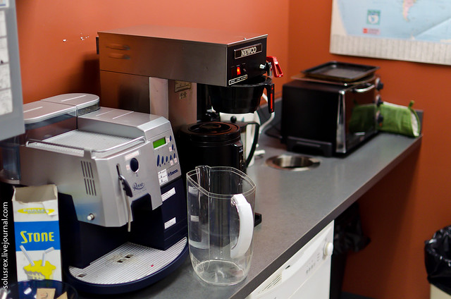 19. Ладно, запускаю компиляцию, и пока она идет, надо сходить на кухню, заварить себе чайку. На кухне у нас два кофейных аппарата. Сколько я не работаю в хайтеке, всегда программисты очень требовательны к кофе и всегда оно им не нравится. При этом пьют его ведрами. Я же пью только чай.