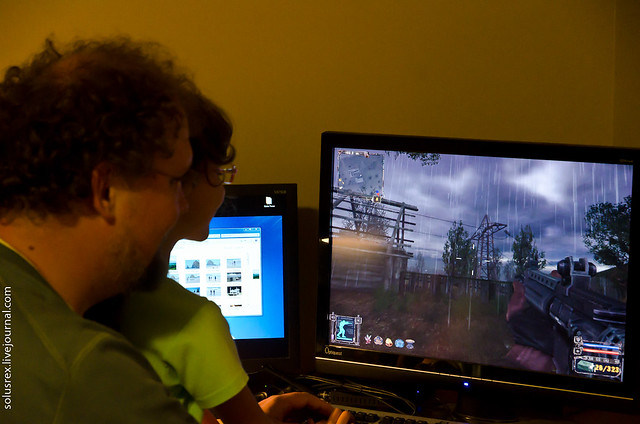 76. Дома дочка ждет меня, чтобы чуть-чуть поиграть на компьютере. Мы играем в Сталкера. Она следит за здоровьем и вовремя нажимает аптечки и бинты.