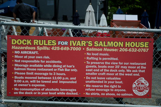 Кушали мы в местечке под названием "Ivar's Salmon House". Стоит он прямо на берегу и имеет свою пристань. Народ подплывал на катерах, чалился и бежал купить что-нибудь на ужин. Забавно, что на самолетах прилетать не разрешается. Нельзя и все, так и сказано: NO AIRCRAFTS.