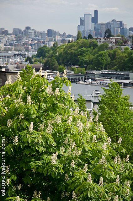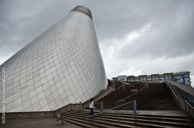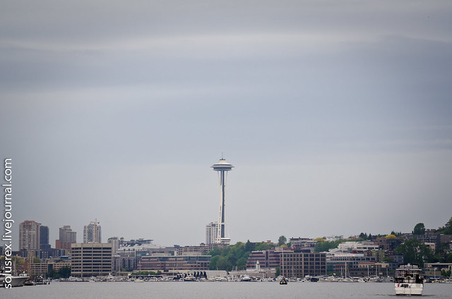 Символ города - Space Needle (космическая игла). Мы там раньше бывали, там есть вращающийся ресторан и отпечаток ноги лунного космонавта Армстронга. Дождик, кажется, все же собирается.