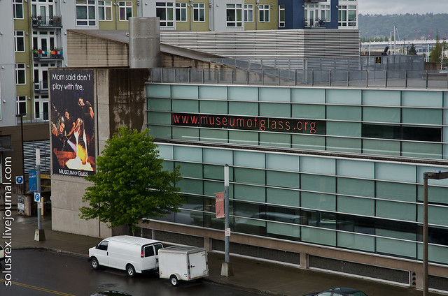 Осталось только рассказать о музее стекла в Такоме. На плакате написано "мама сказала не играть с огнем" и изображена группа стеклодувов.