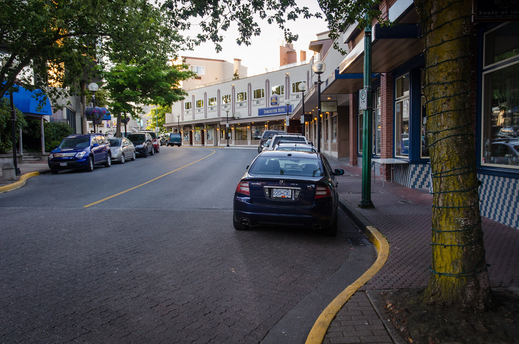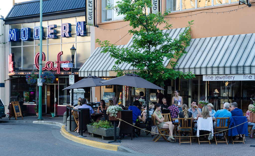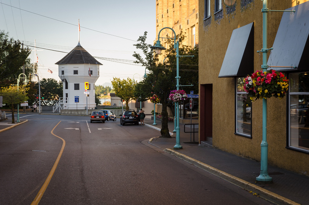 Центр Нанаймо летом - расслабленная атмосфера, кафешки, легкий бриз с моря.