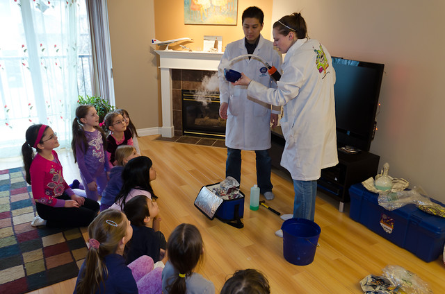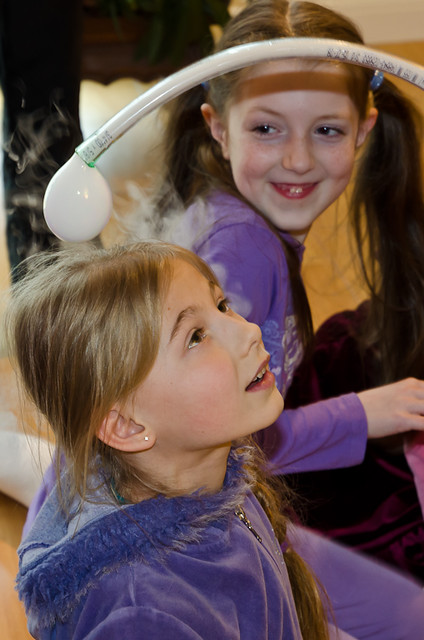 А пати получилось хорошее. Пригласили mad scientists, которые полтора часа развлекали детей интересными опытами. Потом немного потанцевали, съели пиццу и торт мороженное, и занялись подарками. Особый фурор произвела подаренная нами (родителями) надувная радиоуправляемая рыба. Все хотели с ней играть.