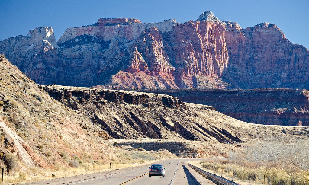 В наше время трудно кого-то удивить. Мир полон удивительными вещами и интернет дает быстрый доступ к лучшим из них. И все-таки, даже насмотревшись предварительно на картинках фотографов на красоты парка Zion Canyon и подивившись красотам его, на деле оказалось все еще удивительнее. Не надо смотреть мои фотографии, смело закрывайте эту закладку броузера и открывайте ту, где продают билеты на самолет до Лас Вегаса. А от Лас Вегаса всего 2-3 часа на машине примерно по таким пустынным пейзажам:
