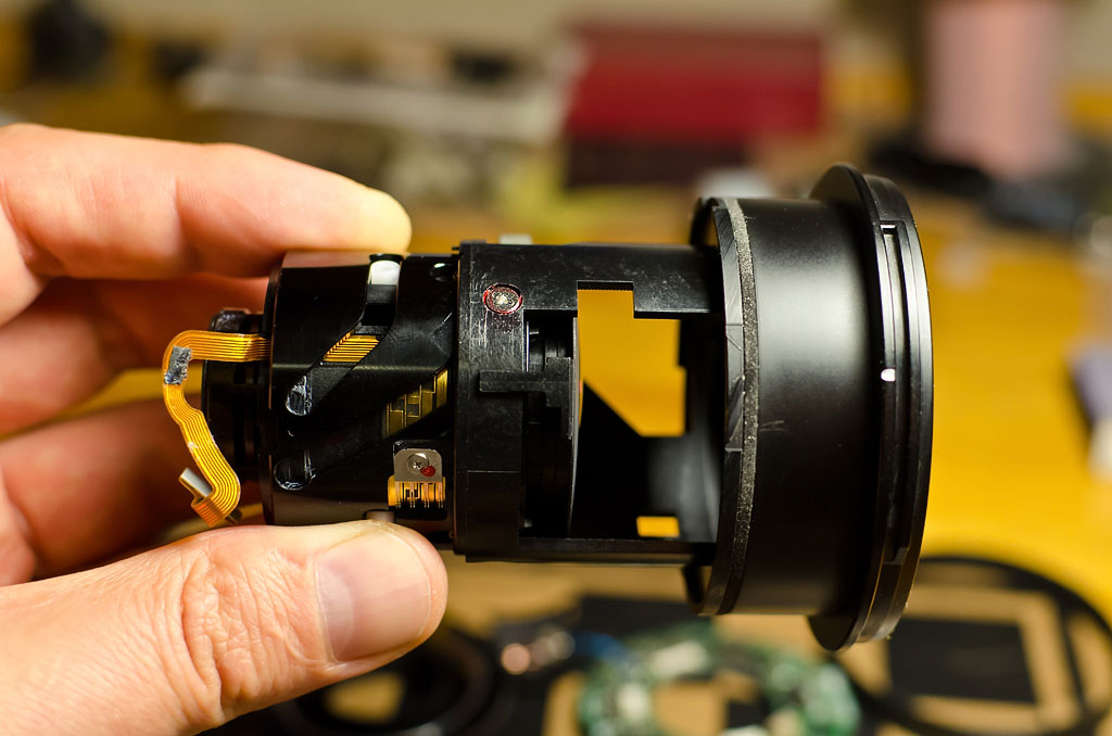 10. Снимаем детали механизма регулировки фокусного расстояния и у нас на руках остается оптический блок. Разбирать его не стоит, потому что юстировку оптики сделать дома почти не реально. Но можно воспользоваться возможностью и почистить внутренние линзы от пыли, у меня ее накопилось немалое количество.