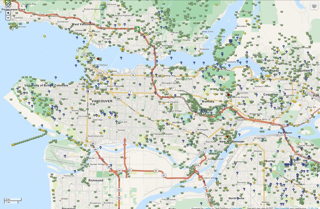 Геокэшинг очень популярен во всем мире. Только в Ванкувере, например, под тысячу геокешей. Все эти значки - это геокеши разных видов.