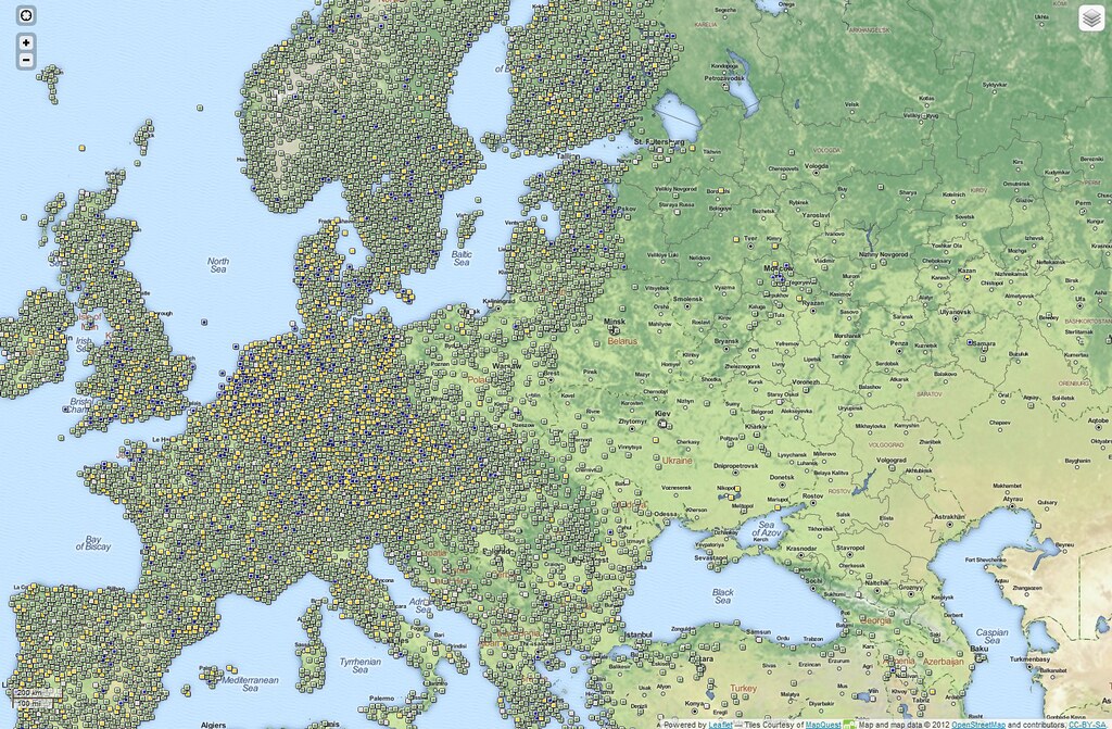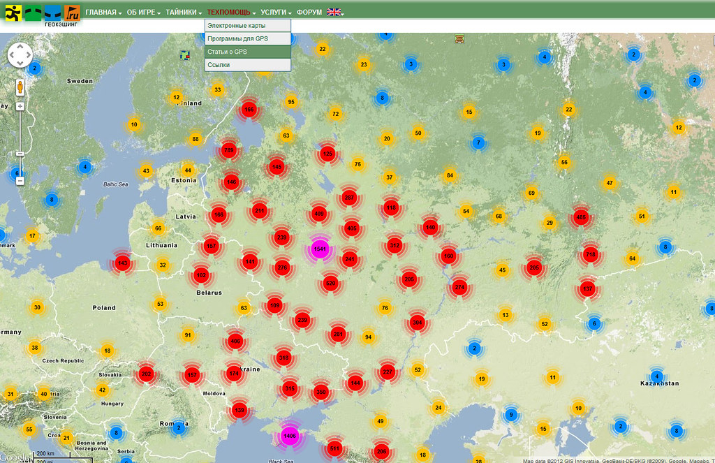 А вот в России, как ни странно, ситуация прямо противоположная. В 5-ти миллионном Петербурге всего с десяток кэшей. Особенно интересно территория России смотрится по сравнению с Европой.