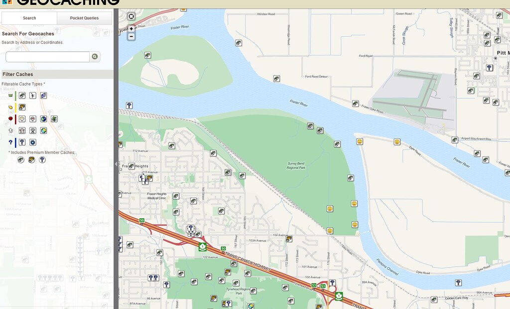 Начинаем мы с того, что заходим на сайт geocaching.com, где у нас есть зарегистрированный эккаунт и там открываем карту. Карта покрыта значками. Улыбающиеся смайлики - это уже найденные кеши, а зеленые коробочки, которых большинство, новые. Взгляд падает на парк Surrey Bend. Мы в нем и не были никогда, отличный повод туда съездить! (я сделал скриншот уже после того, как мы нашли там сегодня наши геокеши, поэтому там смайлики).