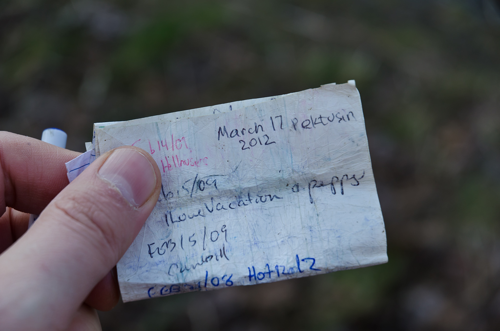 В журнале этого кэша добавляется еще одна запись - наша. Интересно, последний раз кто-то находил этот кеш неделю назад. В пределах города, где много геокэшеров, это обычное дело. Но нам попадались и более старые. Однажды мы нашли такой кэш, который пролежал нетронутым почти два года.