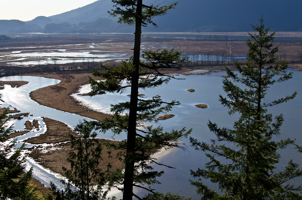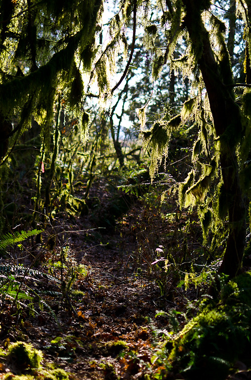 А второй кэш мы назвали Best Pitt Lake View Ever!. Находится он на высоте птичьего полета над всей этой местностью и вид оттуда открывается просто чудесный. Для того, чтобы туда добраться, нам пришлось пройти по закрытому и практически заброшенному трейлу. Он весь зарос мхом, засыпан прошлогодними листьями, и видно, что там давно не ступала нога человека.