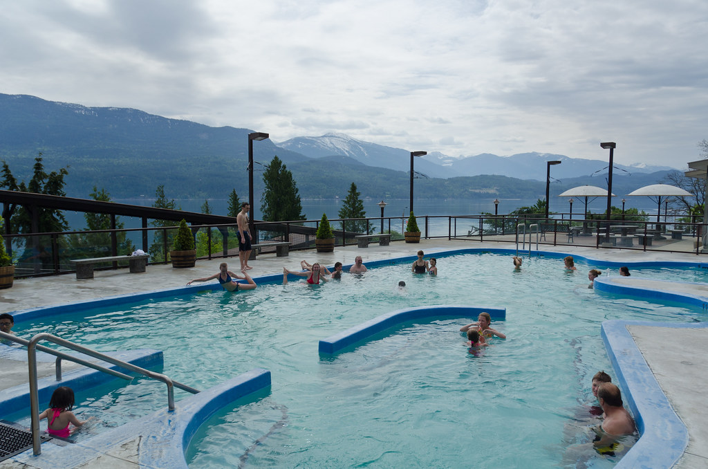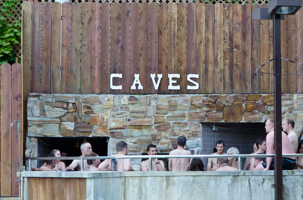 А вот и сама сказочка. Итак, из под земли бьет горячая минеральная вода. И бъет она в этом месте не абы как, а наполняет пещеру, создавая настоящую природную сауну (парную, поправят меня знатоки). Источник принадлежит курорту Ainsworth Hot Springs Resort. И хотя на него пускают людей и извне, предпочтение отдают своим постояльцам - пускают их бесплатно и сколько хочешь раз. А еще есть пара часов утром, когда пускают только своих, в это время народу меньше всего, потому что сам ресорт небольшой, номеров 20-25.