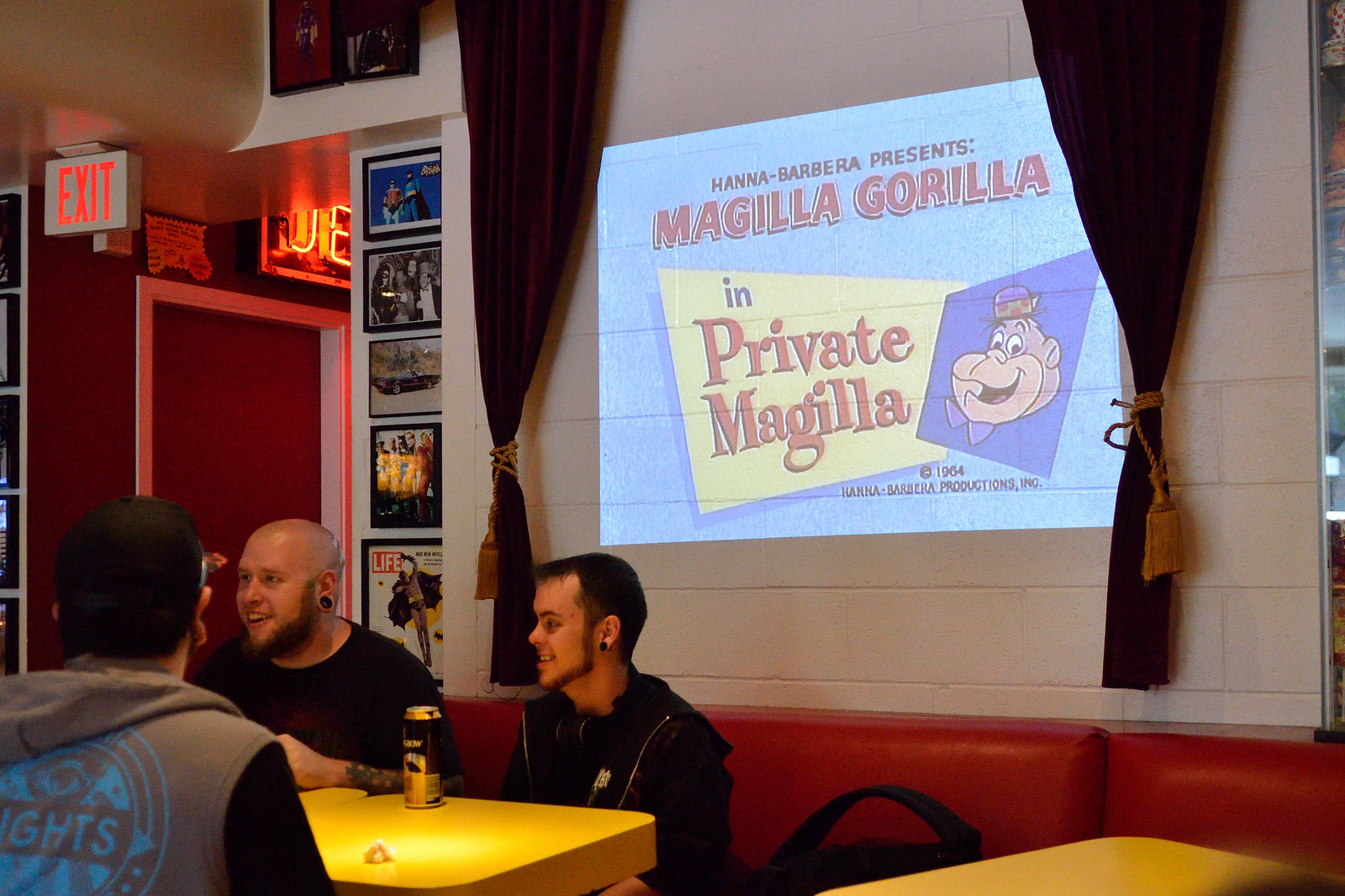 Кафе оформлено под стиль 60-х, проектор показывает мультики тех времен на стене.