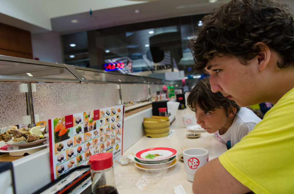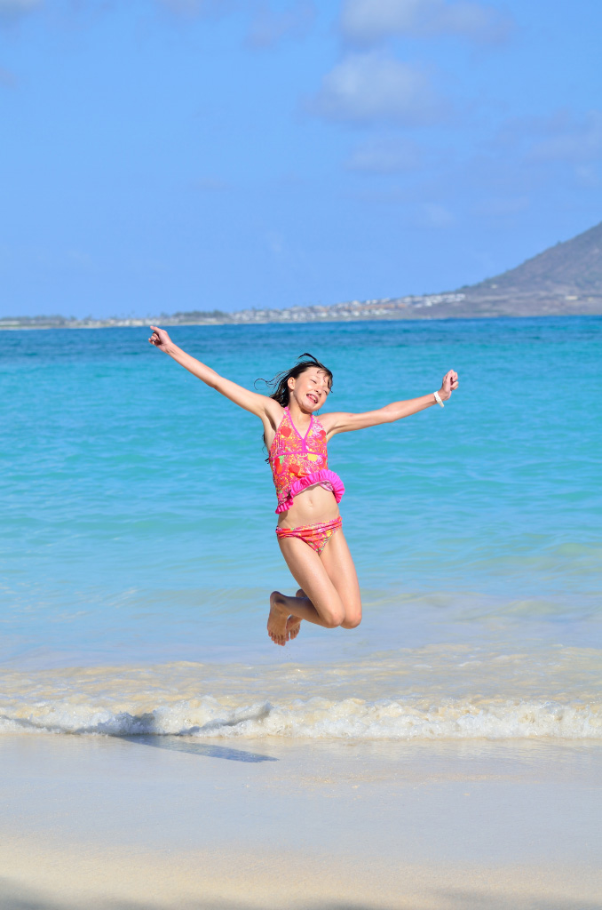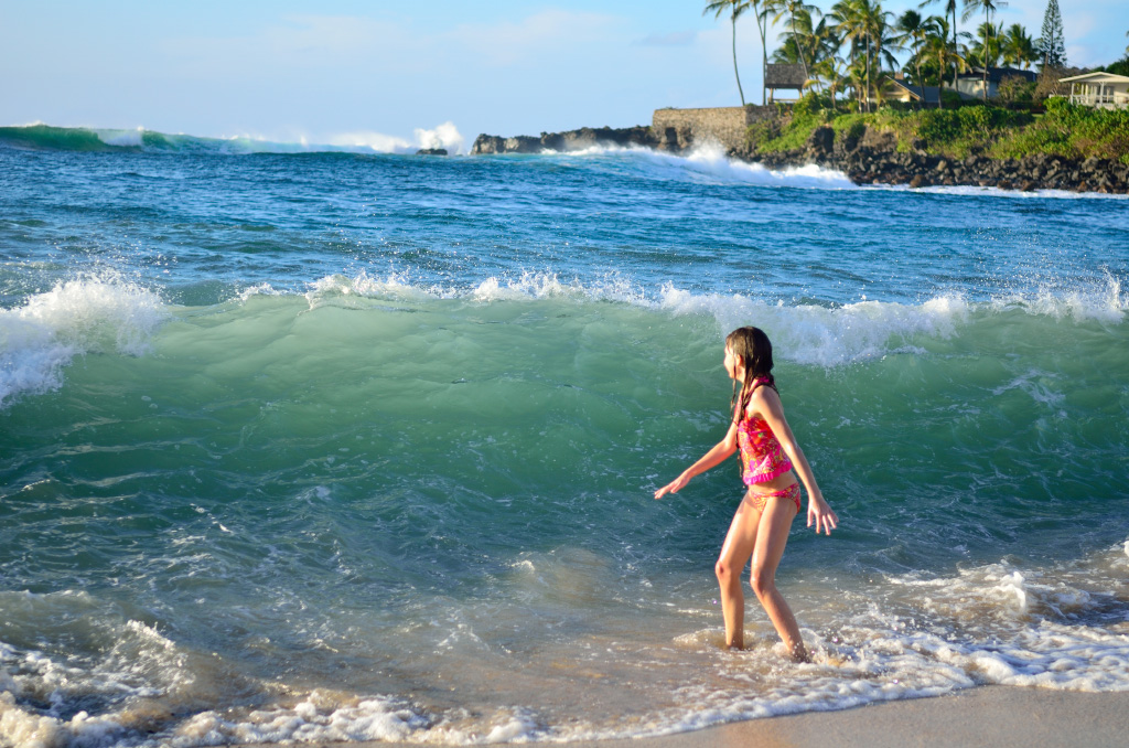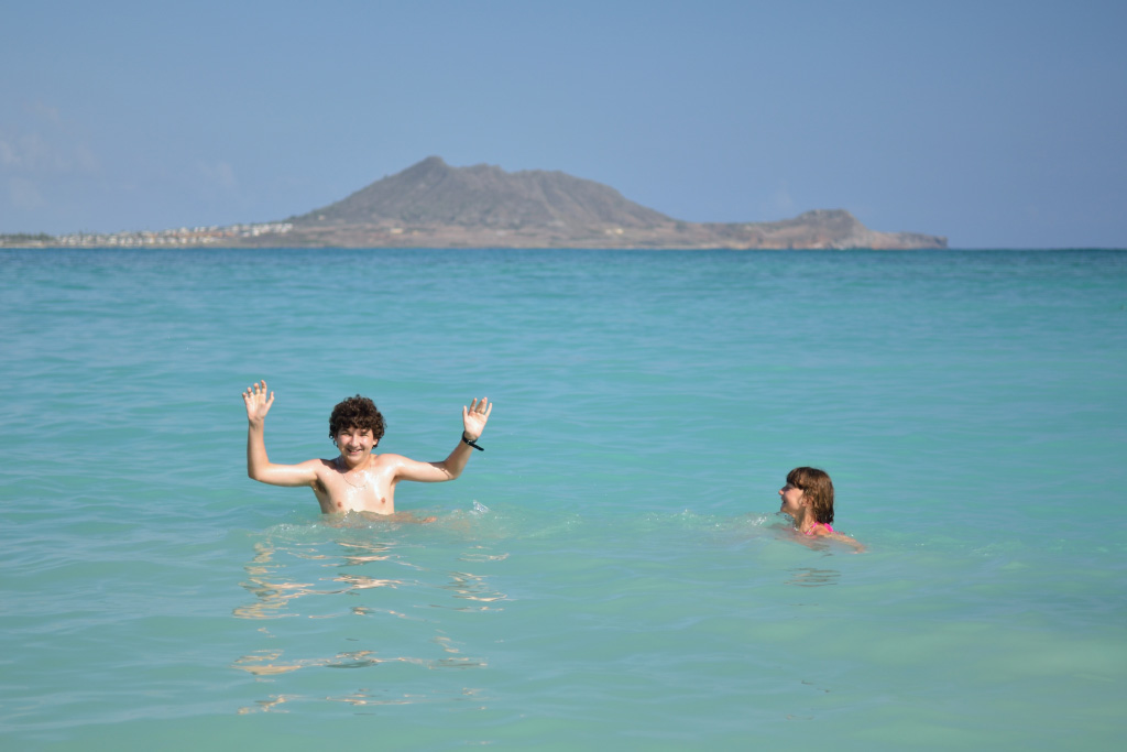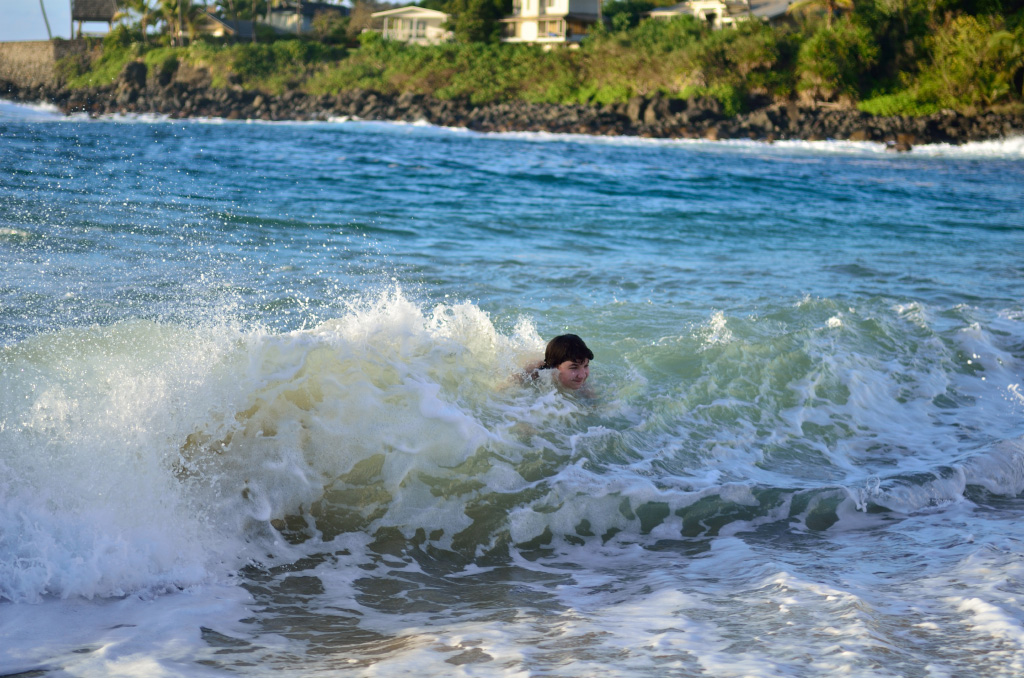 Hi mom! Today was a super-fun day. So, we were starting to walk to the beach that we went on the second time yesterday and dad saw this place where you could rent a car for 24 hours for $130.00 dollars. Dad bought it and I liked it because it was blue and inside there was a lot of space. Then of course we drove to the beach. It was such a relief to ride a car after all that walking yesterday. There was a little floating oval-shaped floating box that looked like it had a geocache on it when you look at the map. Dad and I put our masks on and swam to it. Dad dove down to look at the chain that was holding it 3 times. On the third time, dad accidentally hit it and it floated to the surface where I was swimming. When dad came up, I showed him the geocache. Then we went back to shore and tried to find something to put in it for 100 Japan money. So we were just siting around when dad saw this lens from some kind of sunglasses of something. When he looked into it, it acted like a magnifying glass. We thought that we could put it in the geocache. After we were done, we went to buy some food from Costco. We also got some to eat then. Once we were done, we drove to the other side of the island to a beach. The beach had big waves. First we were scared, but then Dmitry saw that there was a part with smaller ones. While we were swimming, Dmitry saw a double rainbow. It was so pretty! When we were done, we went back to our car and drove all the way to the other side of the island. We dropped off our food from Costco and Dmitry and I went into our room. Dad gave the car back. I really liked the waves today. They were not gigantic, but not tiny waves. Just perfect.