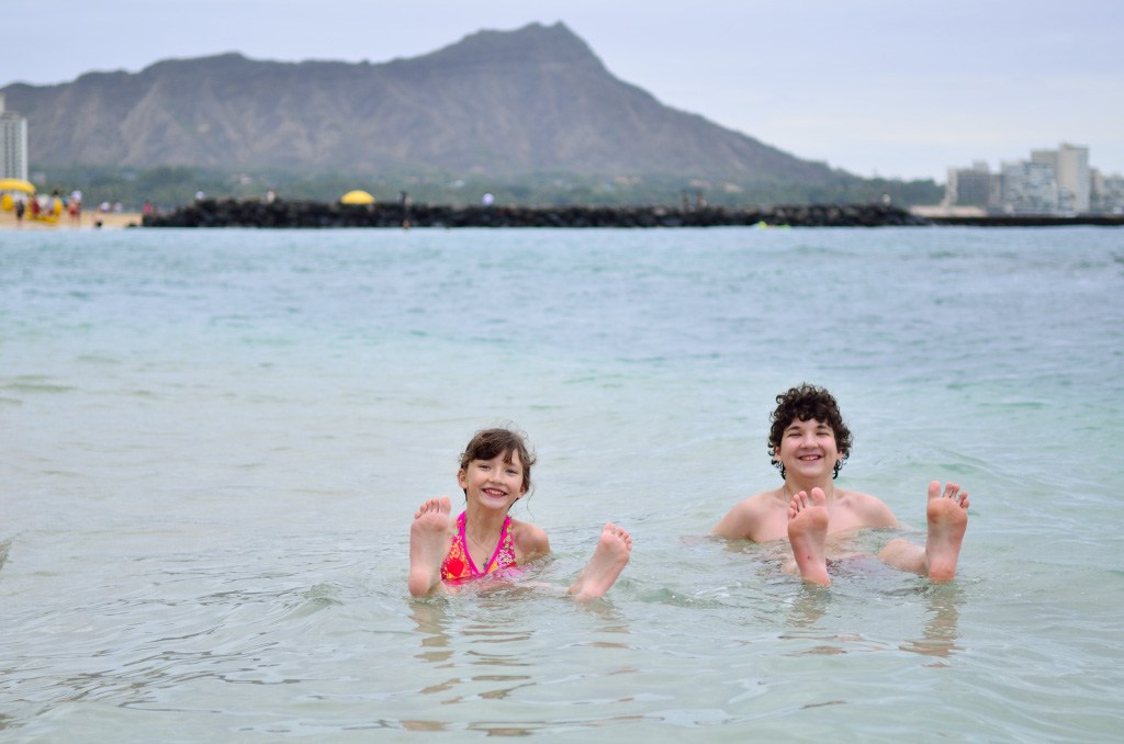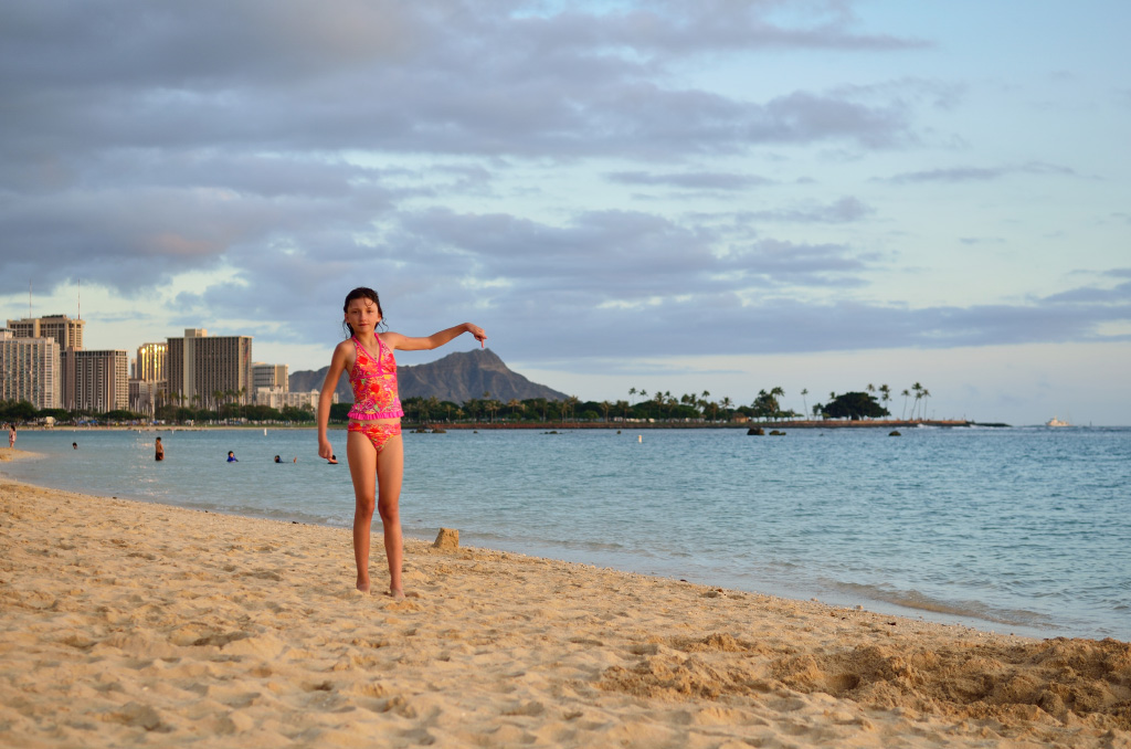 Hi mom! This is Ksenya again. We had an amazing day today. For breackfast, we went to Denny's. They had a menu that had food named something from The Hobbit. When we walked all the way to the beach, Dmitry was the first one to go in the water. Turns out that there were very sharp corals in the sand and Dmitry stepped on one accidentally and now he has a cut on his foot. Dad and I were swimming and the water was not that cold. It is amazing that in December we can swim in the ocean. Once all of us were just relaxing, it started raining so we ran to the hotel as fast as possible. At the hotel we relaxed a bit and then walked to a ice cream shop. When we got our ice cream, we went to another beach where there were bigger waves. It was really fun though. Once we were done with swimming, we walked over to this restaurant that had Hawaiian food. When we got there, turns out that it was closed. We walked so long for nothing! So we went back and took some subway. I'm actually lying beside a piece right now. We were really tired by then so we went straight to the hotel. Well, that brings us to now. Anyway, today was a very good day, even if it was only the first.