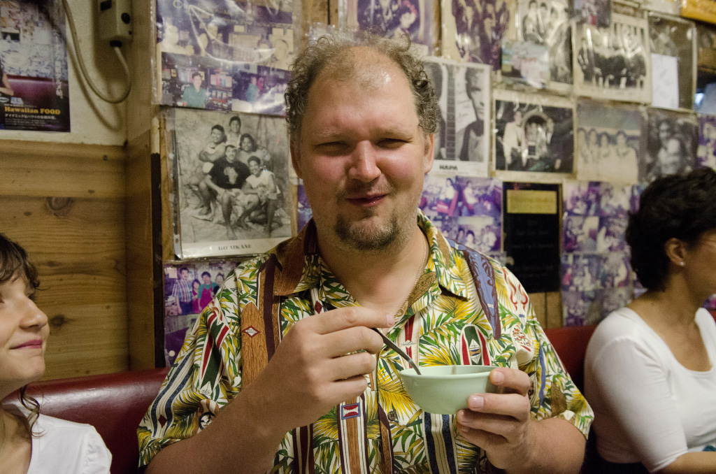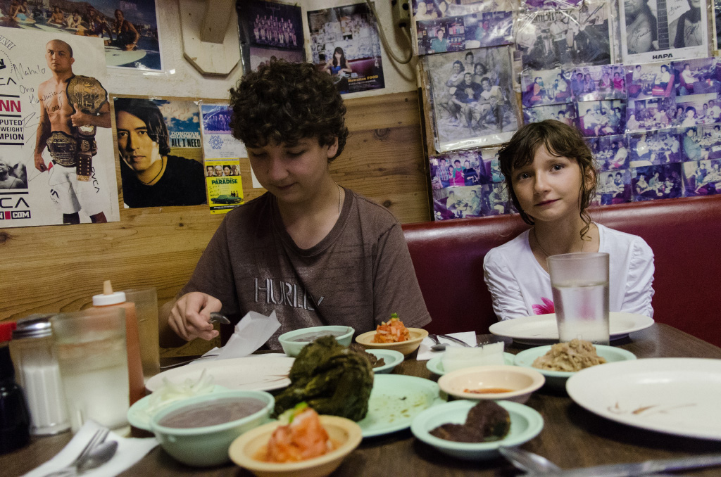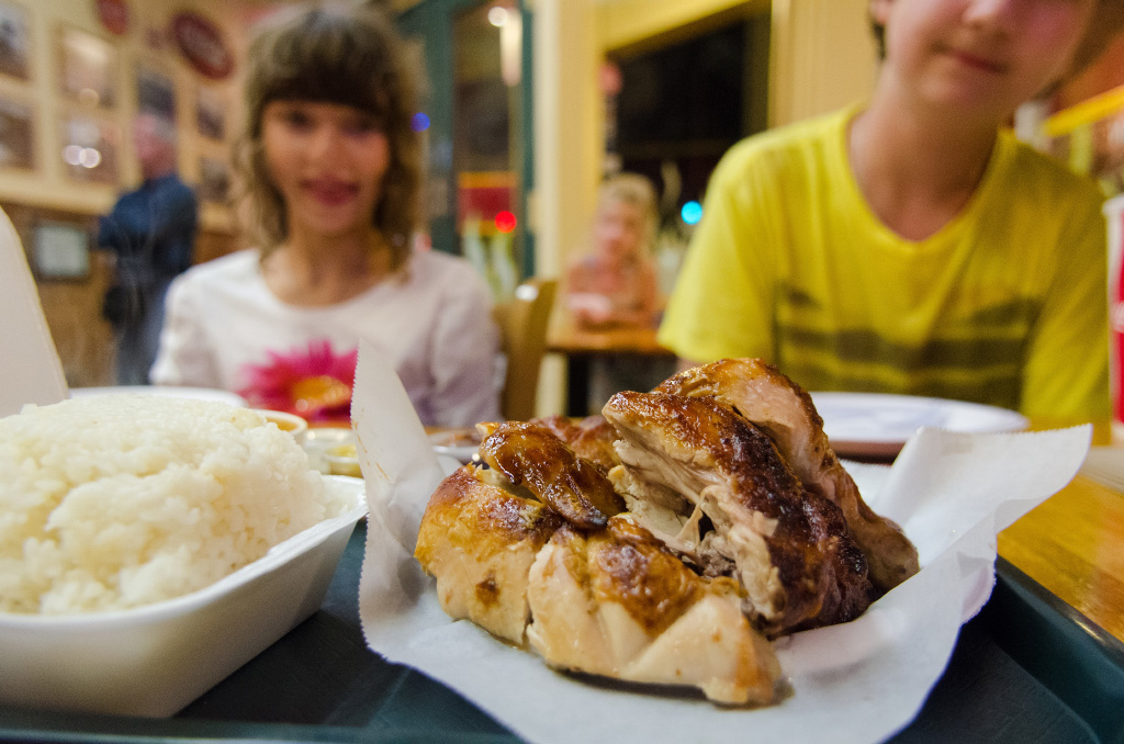 Today was a good day since we are trying to do as much as possible these days. Tomorrow is the last day in Hawaii, how sad, but then I get to see you! First, dad rented a car that can put it's roof back. We drove to Kailua. The water there was really warm and the sand was soft without rocks or corals. Dad and I went a little off the beach to find a geocache. We found it since it was only 2 out of 5 stars. Way too easy for us! This was our 129th geocache. When everyone was ready, we drove to the beach with kind of big waves. We drove all around the island to find a beach with waves. We ended up at this one. It was really, really fun. Some waves were big, so I had to dive under it, and some were little but sandy so I had to clear my swimsuit from sand. At the end, there was a gigantic wave so dad helped me dive in, but even under it, the water swirled me and dad all around. Luckily, we got out of it and ran to our things. I thought it was enought for today. Then dad drove us to this chicken restaurant. We took a whole chicken to share.