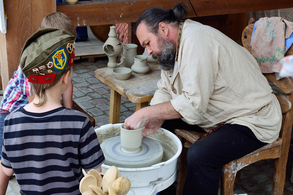 Помимо монастырей и пристани на острове имеются народные промыслы для туристов. Тут вам мастера вылепят кувшин, свяжут лапти и вырежут деревянную ложку. Еще имеется предприятие общественного питания, куда меня завлекло меню с обещанием стерляжей ухи, пельменей ручной лепки, селедочки с картошкой и других разносолов. Однако в реальности все, что нашлось в этом трактире - это только гречневая каша с котлетой и чай.