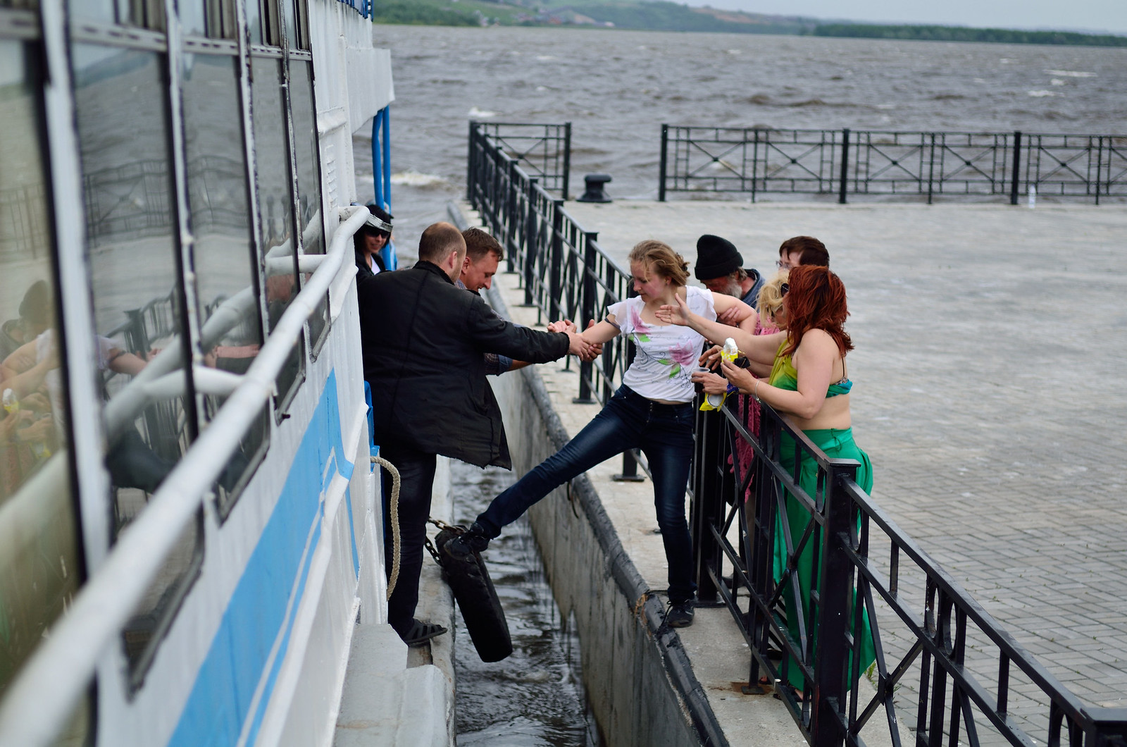Пора в обратный путь. Не все пассажиры успевают вовремя и их втаскивают за руки на медленно отходящий теплоход. Но чья там виднеется знакомая борода?