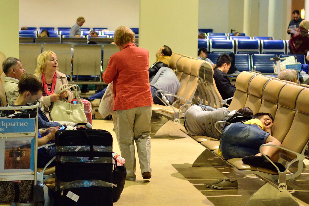 3 часа ночи, а кругом столпотворение. Кругом лежат, сидят и стоят люди. По громкой связи между объявлениями рейсов зачитывают статьи из Конституции об ответственности за разжигание национальной розни и за дачу взяток. Причем, подчеркивают, если давший взятку раскаялся и пришел с повинной в течении суток, то он может быть прощен.