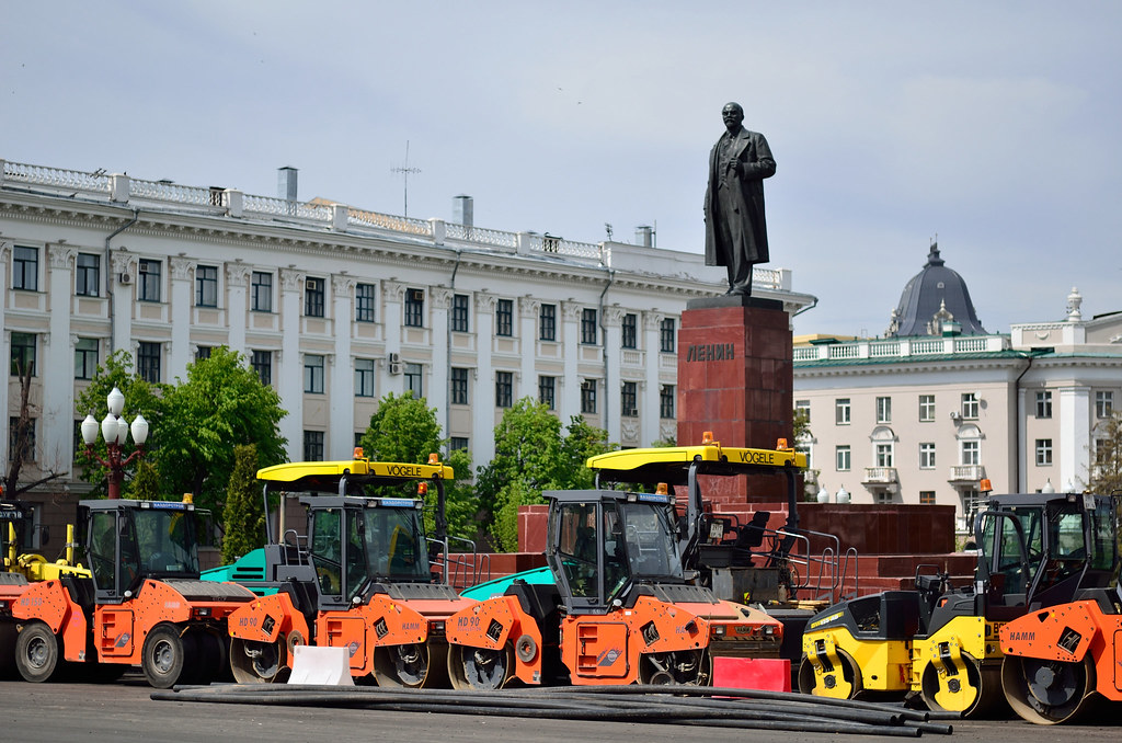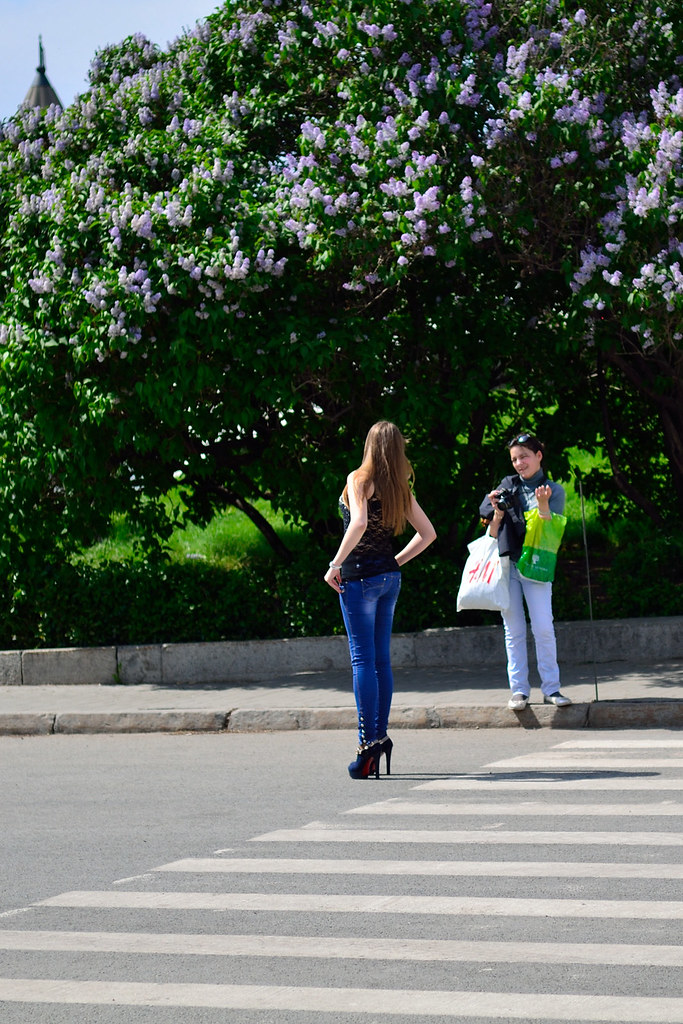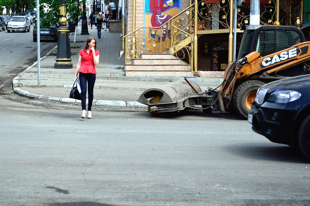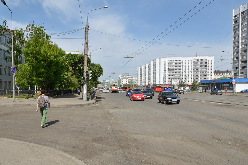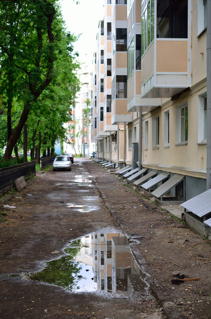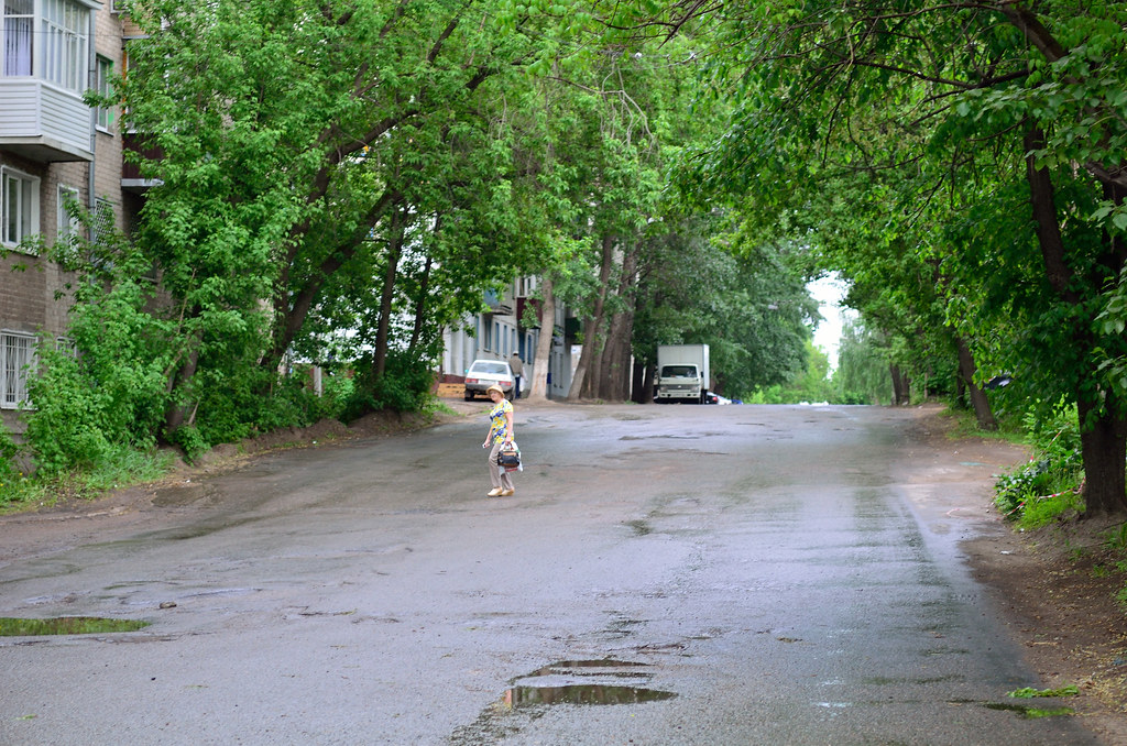 19. Улица Татарстан. Асфальт снят, вот-вот дорогу зальют новым, и здесь впервые будет гладко. Человек в зеленых штанах - художник Миша Пивоваров. У него в июне выставка в Санкт-Петербурге и он идет рисовать очередной шедевр, вместо того, чтобы погулять с другом детства.