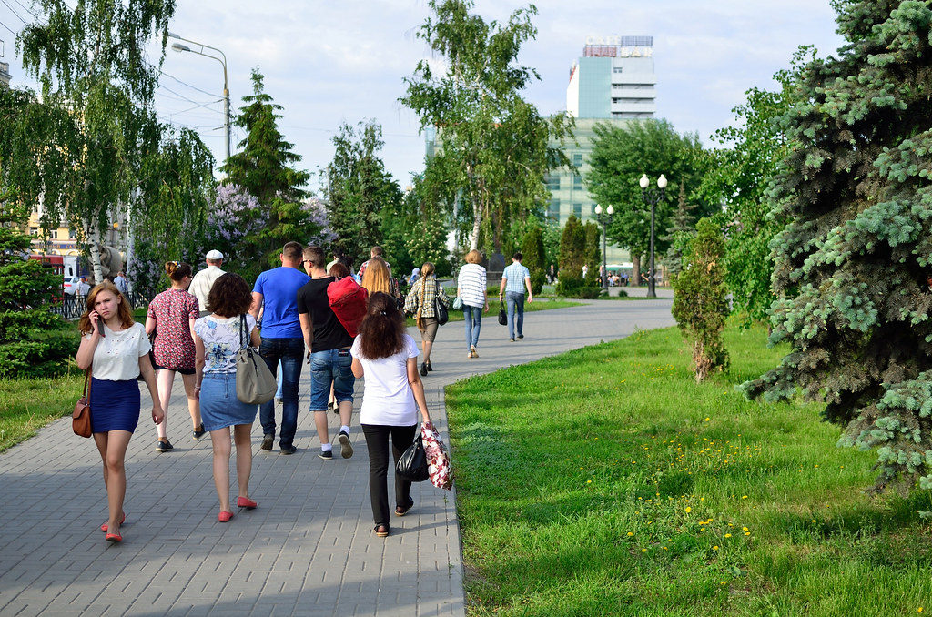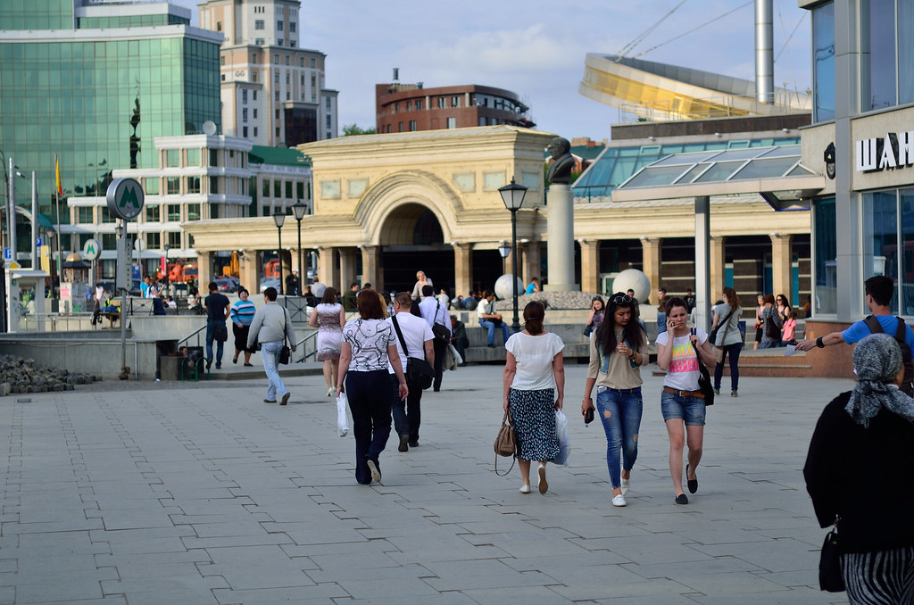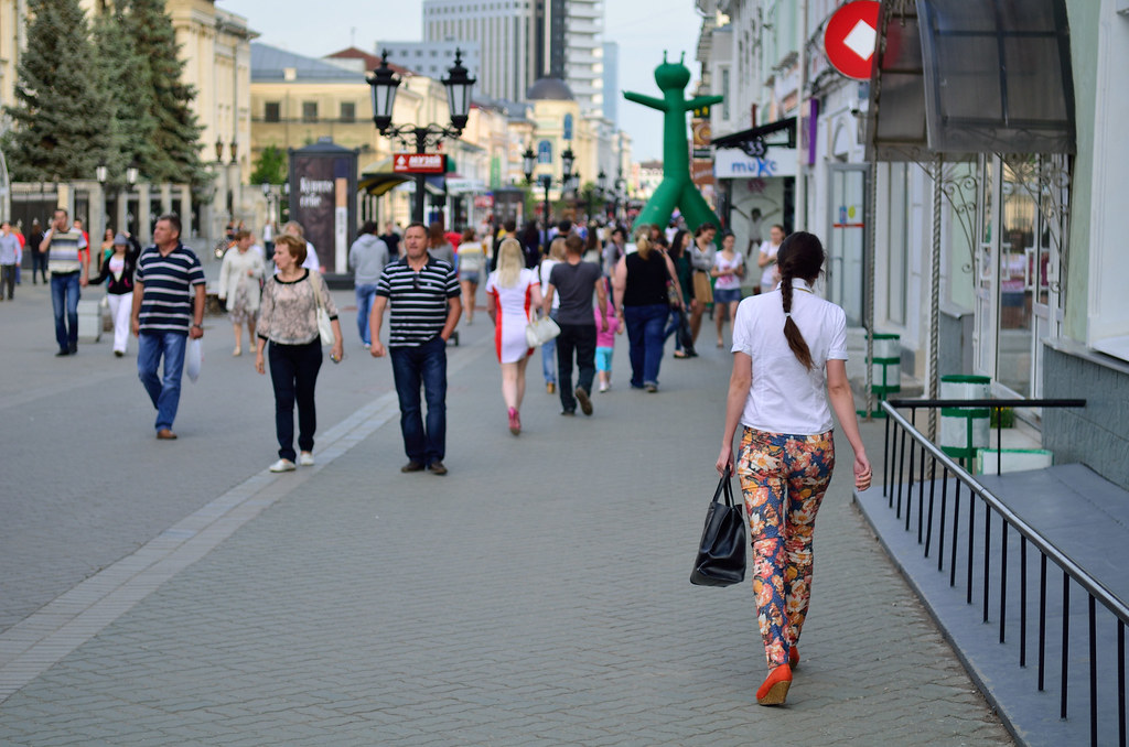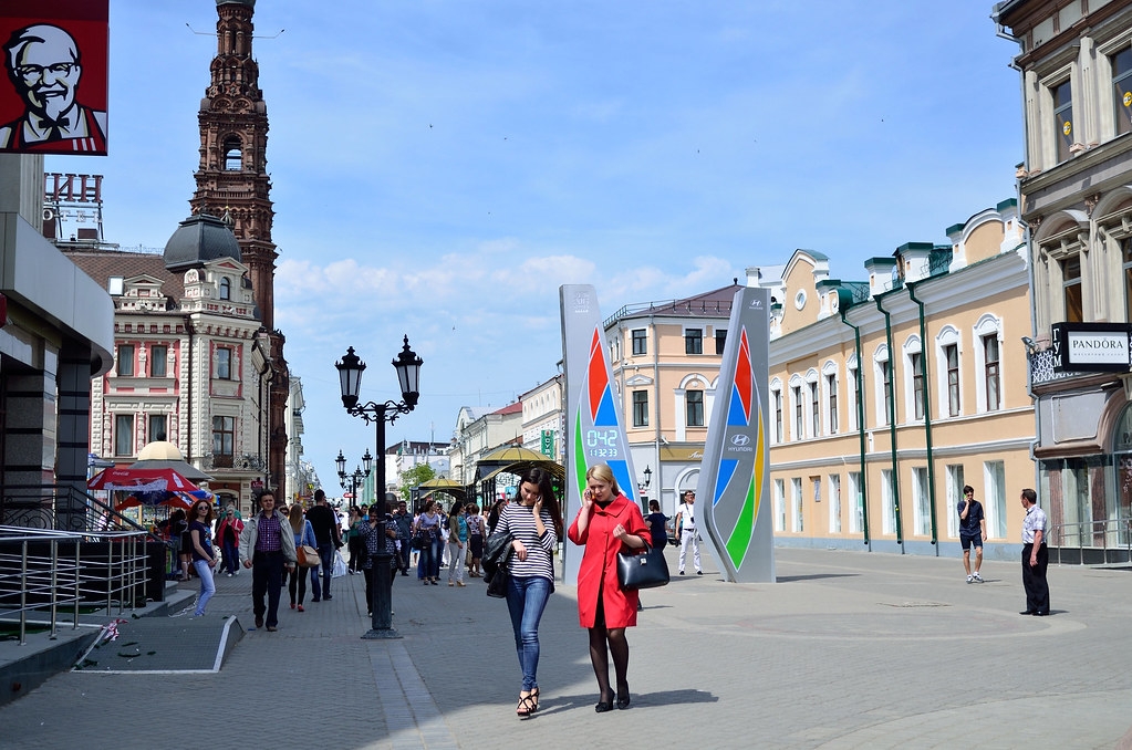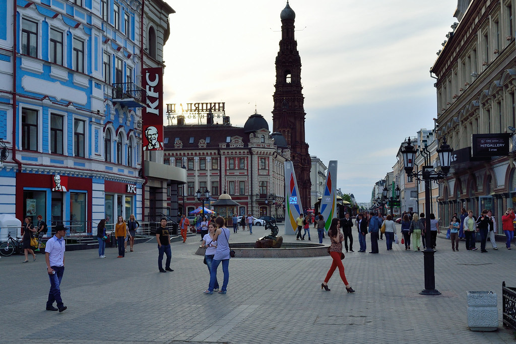 5. Улица Баумана. На заднем плане видны часы с обратным отсчетом времени до начала спартакиады. На центральной площади города открылся ресторан KFC.