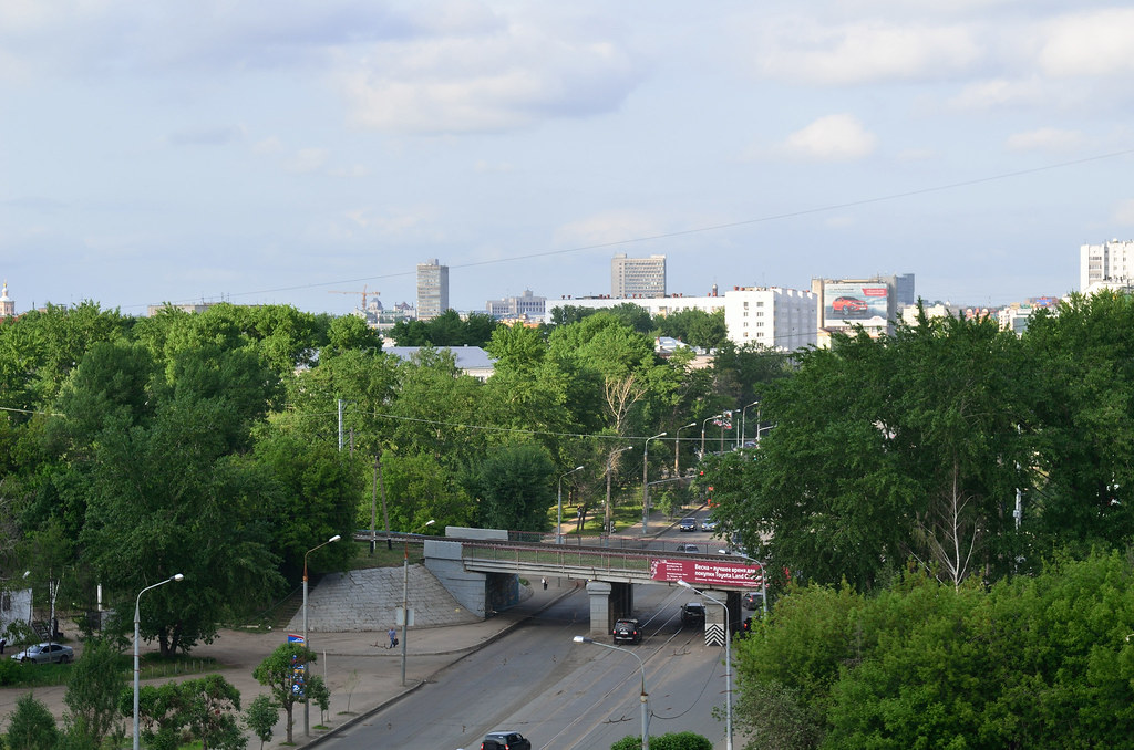 26. Вид на город с высоты ПП. Две высотки в центре - это университет, в который когда-то бегал юный Ленин. Точнее, эти корпуса построили позднее, а туда, куда бегал Ленин отсюда не видно. Ниже - железнодорожный мост. Здесь идут поезда на Урал и в Сибирь (если на право) и в Москву (если налево).