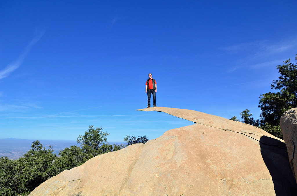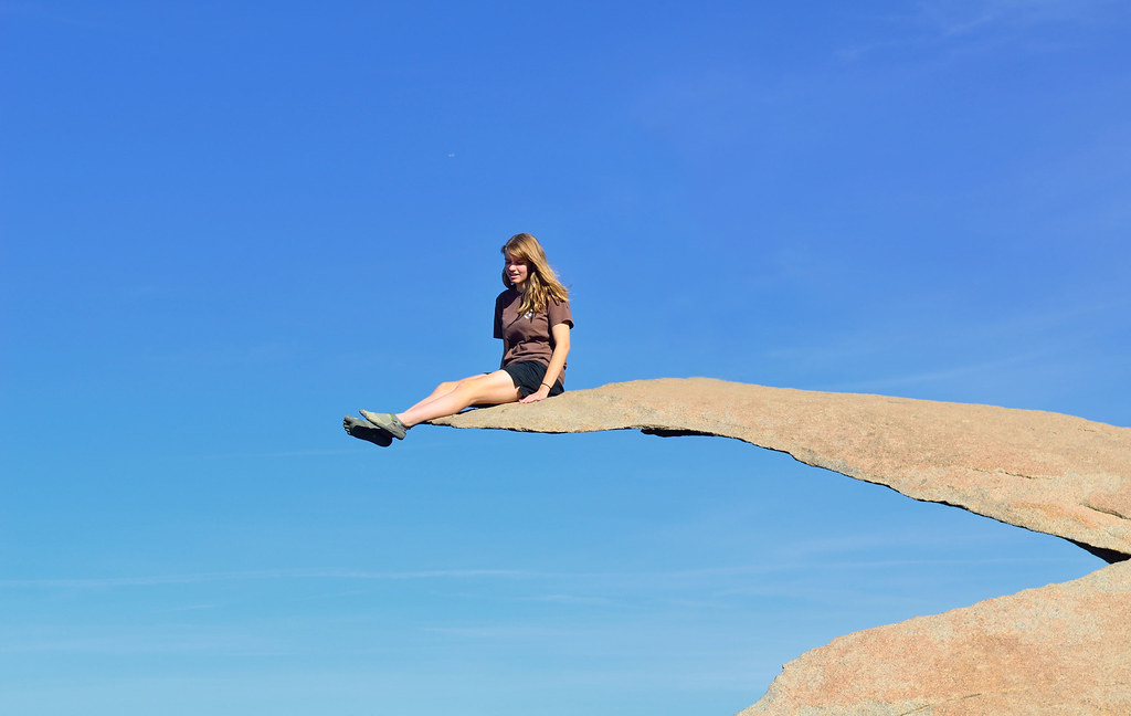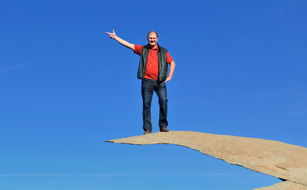 Это такой тонкий лепесток гранита, торчащий из монолита. Несмотря на свою кажущуюся хрупкость, он весьма крепок. Я на нем танцевал и прыгал для нашего ежегодного танцевального видео. И все равно немного страшновато, он нависает хрупким карнизом метрах в 15 от земли.