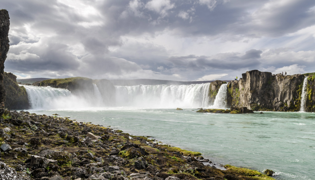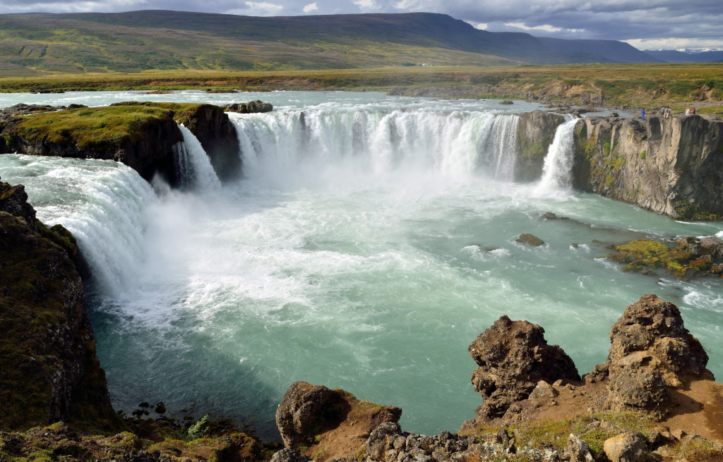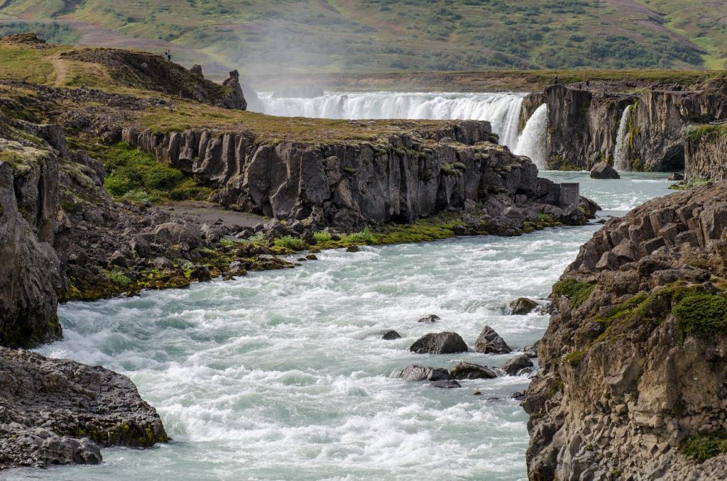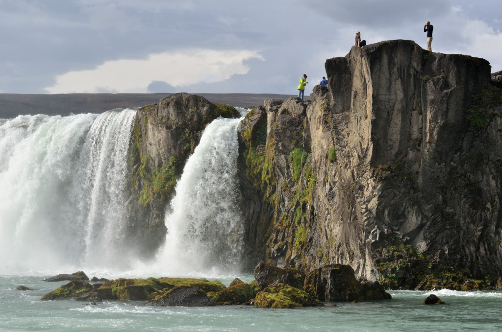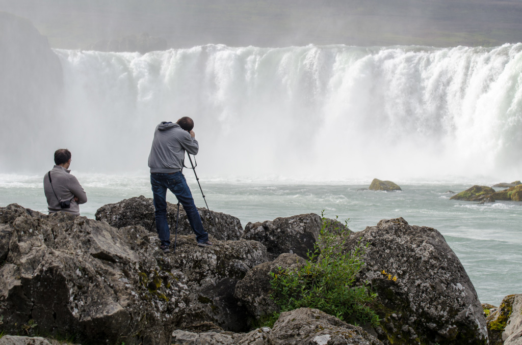 Следующая остановка - водопад Goðafoss. Посмотреть на него можно с обеих сторон, но красивее всего он с правой стороны, если смотреть вниз по течению. Мы сперва пошли было налево, перешли по мосту, хотели спуститься к реке, но тропа вниз была закрыта веревочкой с запрещающей табличкой. Через эту веревочку, впрочем, перешагнули местные на вид рыбаки с удочками, и я тут же вспомнил, как перелезал в Петербурге ограждения и гулял по крыше Исакия, дескать это туристам нельзя, а нам можно.