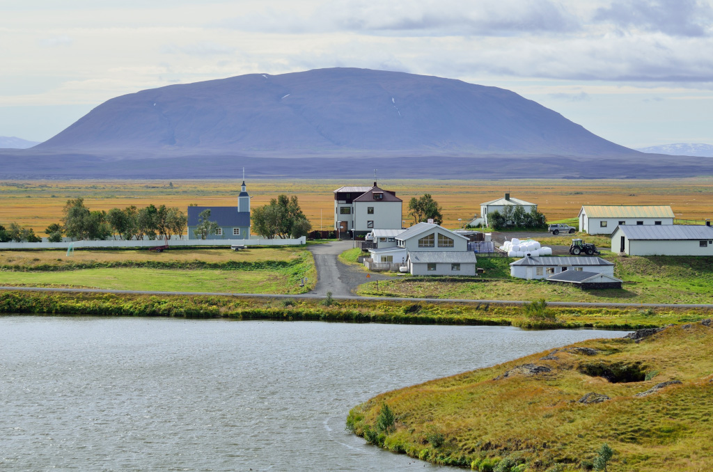 Типичный исландский пейзаж: домики, церковь, поля и вулкан на заднем плане.
