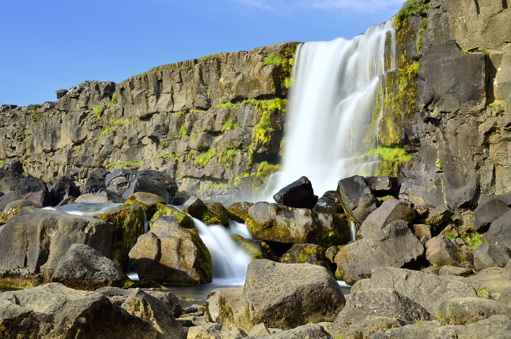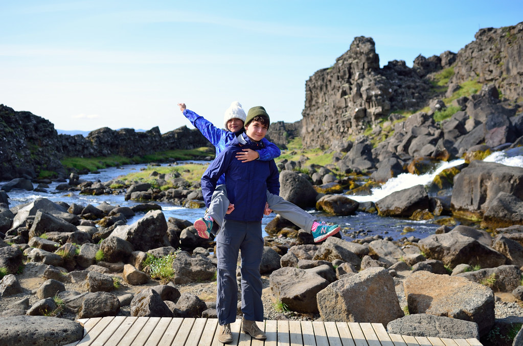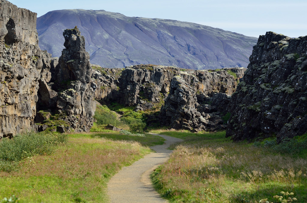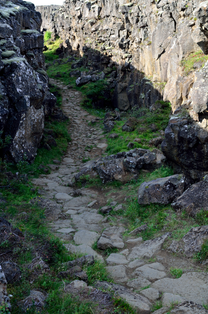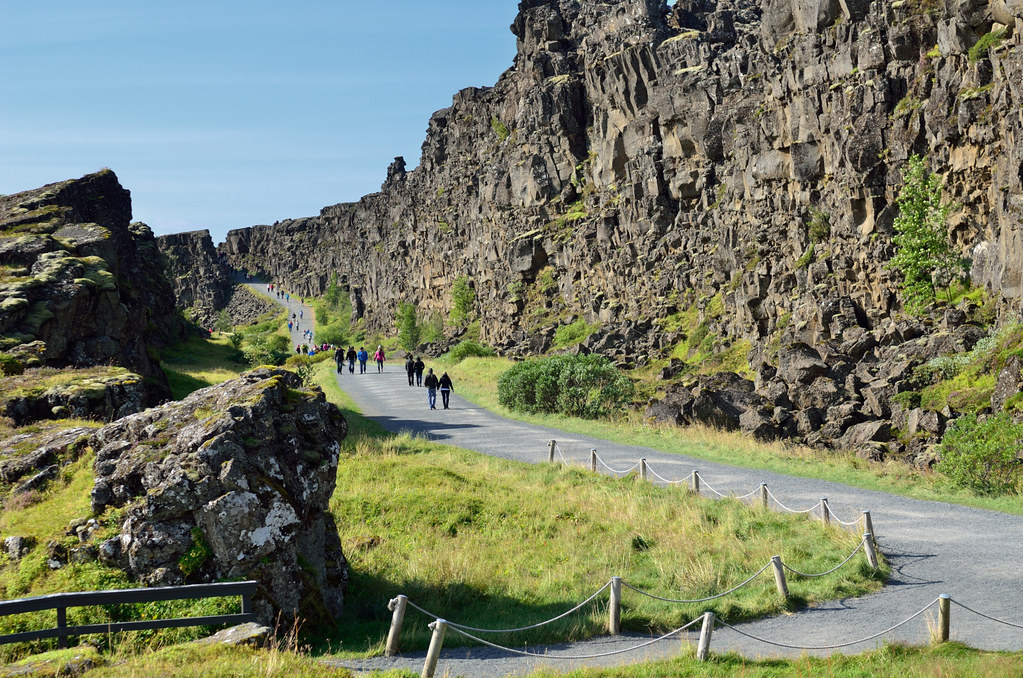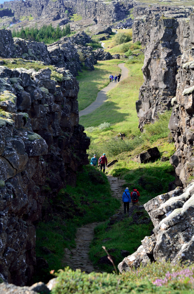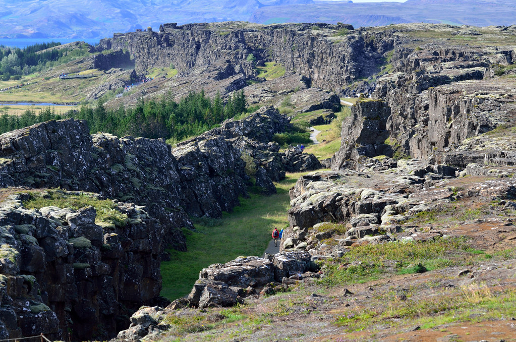 Наша первая остановка - местечко Thingvellir (Þingvellir). Примечательно оно двумя моментами. Во-первых, здесь трескается по шву земная твердь и американский щит ползет прочь от евазийского. Отсюда и живописная трещина. Во-вторых, это историческое место, здесь собирался парламент Исландии чтобы обсудить вопросы, принять законы, наказать виновных и поощрить достойных. Ведь оно как было, тысячу лет назад дюжина викингов поделила остров и стали жить-поживать, добра наживать. Рост количества добра приводит к конфликтам, войнам и переразделу имущества. Однако эти викинги проявили завидную мудрость и регулярно собирались чтобы конфликты уладить. Общение облегчает понимание! Всем бы так.