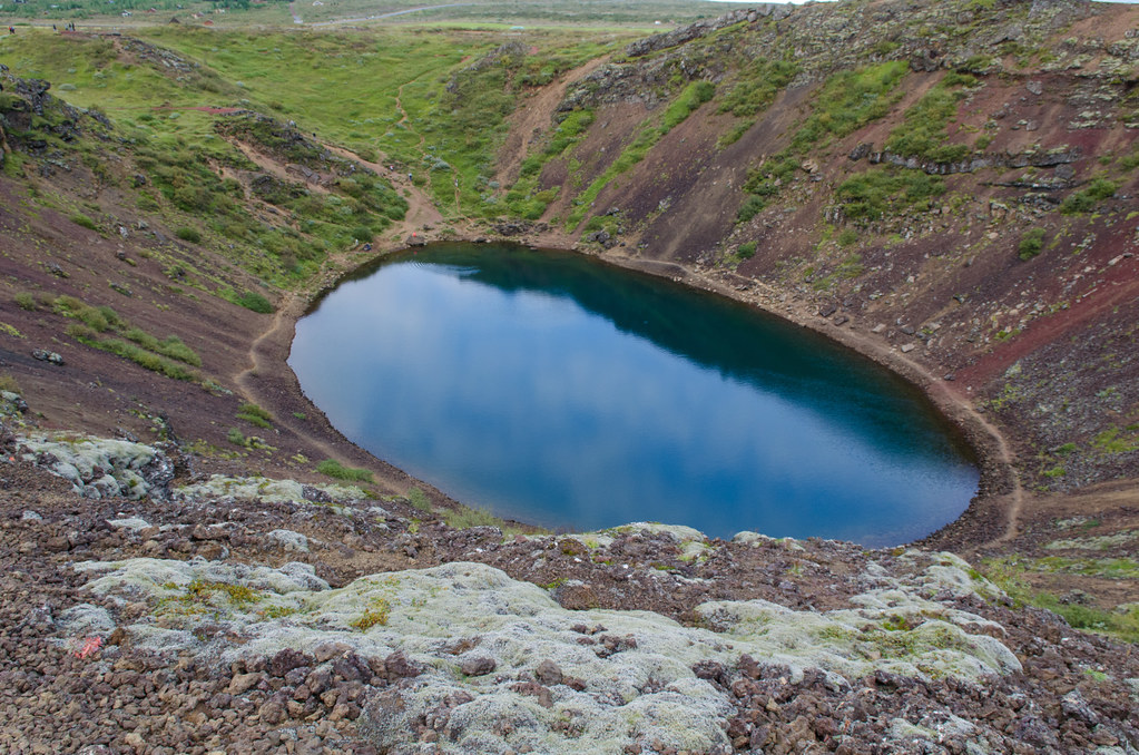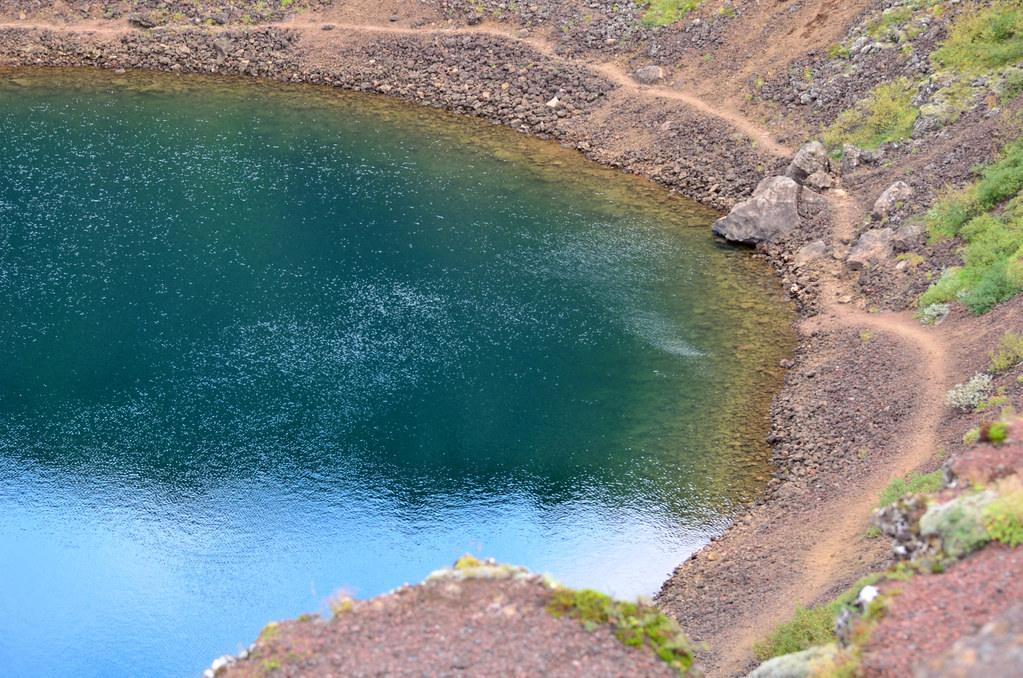 За вход на кратер Kerið берут плату. Немного, долларов 5 с человека, дети бесплатно. Взамен дают брошюру с информацией. Из нее мы узнали, что правильно называть это не кратер, а кальдера, и что образовалась она 3тыс лет назад, глубина воронки 55 метров, а глубина озера - от 7 до 14 метров. Не такая уж и большая плата за такое количество информации.