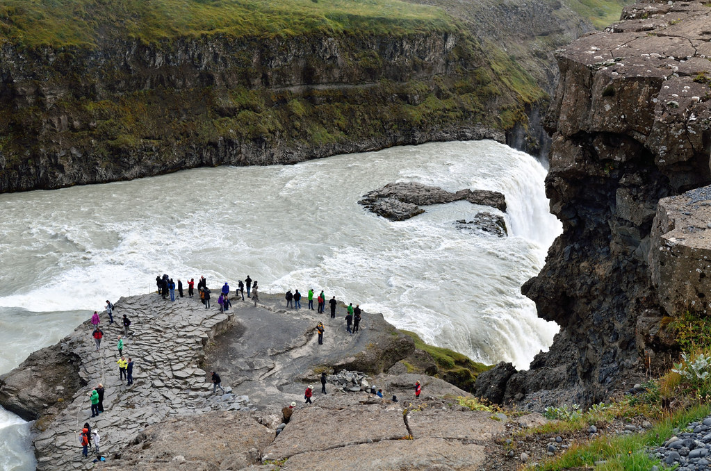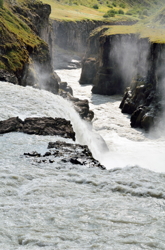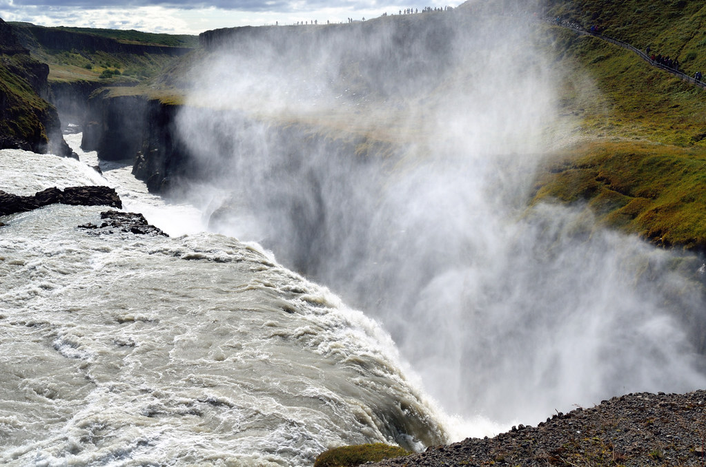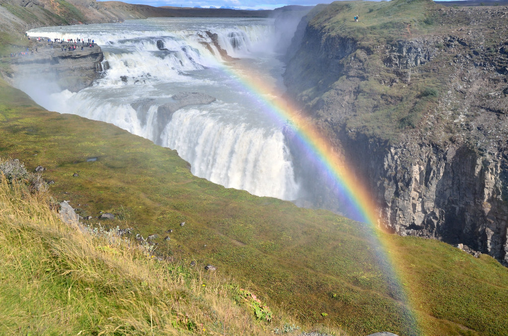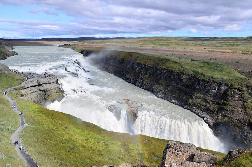 Водопад Gullfoss, наверное, самый фотографируемый и узнаваемый водопад Исландии. Gullfoss переводится как Золотой водопад. Причем те, кто его фотографирует в пасмурную погоду, жалуются, что не разглядели золотого цвета из-за серого неба, ну так вот он вам в солнечную. Куда золотишко спрятали, а?